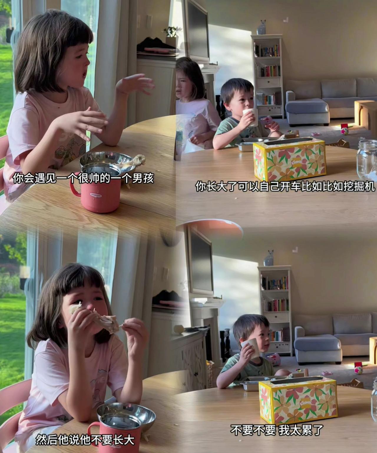 安露西吃饭多了,小黄在一旁笑着打趣:“吃得多才能快快长大,等长大了,就能有自己的小家庭啦!” 安露西的眼泪就像断了线的珠子,顺着脸颊往下淌,她认真反驳:“我不要长大!长大就要离开这个家” 一旁的安呈旺见此情景,忍不住想逗逗凯文弟弟,看看他对“长大”有什么想法。他特意拿来凯文最爱的汽车和挖掘机玩具说等你长大了,就能自己开真的汽车和挖掘机, 可没成想,凯文却使劲摇了摇头,脆生生地吐出“nono,还一本正经地补充:太累了 哈哈,谁能想到,小小的凯文弟弟居然有这么“前卫”的想法,连心爱的玩具都诱惑不了他想“停在童年”的心!