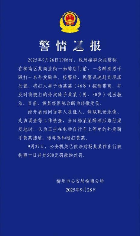 顺丰给饿了么骑手每人5000元奖励! 顺丰骑士被醉汉围殴,饿了么兄弟组团挺身而出,反手就被顺丰砸下5000元奖励,还加码500万见义勇为基金! 9月26日傍晚的柳州,柳南区谷埠街的咖啡店门口刚亮起暖黄的灯。 30岁的顺丰同城骑士黄某像往常一样坐在电动车上刷着订单。 手机屏幕的光映在他的头盔上,周围是下班人群的脚步声和电动车的鸣笛声。 谁也没料到,这场再平常不过的等单时刻,会突然变成一场毫无征兆的暴力袭击。 事情的起因说起来有点荒唐。 一位46岁的男子杨某某醉醺醺地晃到黄某身边,一把抓住电动车的车把,含糊不清地让黄某载他去别处。 黄某赶紧解释自己正在上班,没办法帮忙,说完就低头继续看订单,想着对方喝醉了,不理会或许就会离开。 可杨某某却不依不饶,又凑上来喊了一遍,见黄某没回应,突然就翻了脸。 先是指着黄某破口大骂,接着抬手就推了一把电动车,车子“哐当”一声倒在地上。 黄某还没来得及扶车,杨某某已经拽下他的头盔,用头盔往他头上砸,脚也不停往他身上踹,边踹边喊“走不走?你到底走不走!” 黄某被打得蹲在地上,双手护着头,全程没还手。 他后来跟工作人员说,一是不想把事情闹大,二是想着赶紧报警处理。 旁边路过的市民见状都停了下来,有人赶紧掏出手机,大喊着“打人了!快报警!” 就是这声喊,让正在不远处等单的几位饿了么骑手冲了过来。 穿蓝色工服的贺顶第一个跑过去,从侧面死死拉住杨某某的胳膊,不让他再动手。 谭伟鹏和王晓冬也跟着上前,一人按住杨某某的肩膀,一人死死攥住他乱踢的腿。 韦东毅和韦健则挡在黄某身前,生怕杨某某挣脱后再伤害人。 几个人合力把杨某某按在墙边,直到民警赶到现场。 民警到的时候,杨某某还没醒酒,嘴里依旧骂骂咧咧,手脚不停挣扎着“到处踢来踢去”。 最后是两位民警一起上前,才把他控制住带上警车。 后来警方调查时,杨某某说自己当时喝醉了,觉得黄某的电动车挡了路,所以才动手。 可不管是“挡路”还是“拒绝载行”,动手打人都是实打实地违法。 9月27日,柳州市公安局柳南分局就出了警情通报,说已经依法对杨某某作出行政拘留十日、并处500元罚款的处罚。 而黄某经医院诊断,只是轻微受伤,这也算是不幸中的万幸。 暴力事件发生后,不仅现场的市民为黄某揪心,顺丰同城平台也第一时间行动起来。 9月27日一大早,当地的工作人员就联系上黄某,带着水果和慰问品去医院看他,还当场给了他5000元“委屈关怀金”。 工作人员说,这笔钱是给黄某的安慰,毕竟他是在工作时受了委屈,平台不能让他寒心。 更让人关注的是,顺丰同城没忘了那些挺身而出的饿了么骑手。 9月28日,平台通过官方微博发了声明,说已经找到当天帮忙的五位饿了么柳铁站点骑手。 他们分别是贺顶、谭伟鹏、王晓冬、韦东毅、韦健,给每个人都发了5000元“见义勇为帮扶奖”。 声明里还特意提了一句,你们在危急时刻的勇气,不只是保护了我们的骑士,更让大家看到了行业里最宝贵的互助精神。 这事在网上传开后,网友们的讨论也特别热烈。 有不少人心疼黄某,说“看视频里他被踹得蹲在地上,太让人心疼了”。 还有人提到“之前看到有人被扇一耳光赔了5万,不知道这个骑士后续能不能拿到合理的赔偿”。 这些事看起来不大,却都是实实在在的“路见不平拔刀相助”。 他们每天骑着电动车穿梭在街头,为了生活奔波,可遇到别人有难时,却没想着“多一事不如少一事”,而是本能地冲了上去。 而顺丰给骑手发奖励、设专项基金的举动,也让人觉得很暖心。 毕竟“拔刀相助”需要勇气,要是这种勇气能被看见、被尊重,甚至能得到实际的支持,以后遇到类似的事,肯定会有更多人愿意伸出手。 信息来源:潇湘晨报2025-09-29发布:醉酒男子殴打顺丰骑手,5名饿了么骑手挺身而出!顺丰同城:每人奖5千,互助精神宝贵