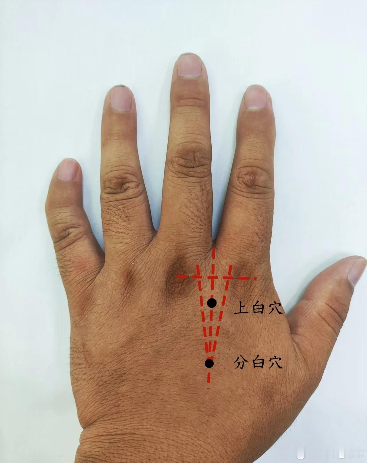 握拳取穴,在手背面,食指掌骨与中指掌骨之间,距指骨与掌骨连接缝上一寸半处,即食指掌骨与中指掌骨连接处,为分白穴。