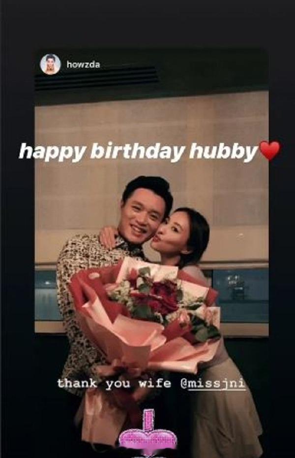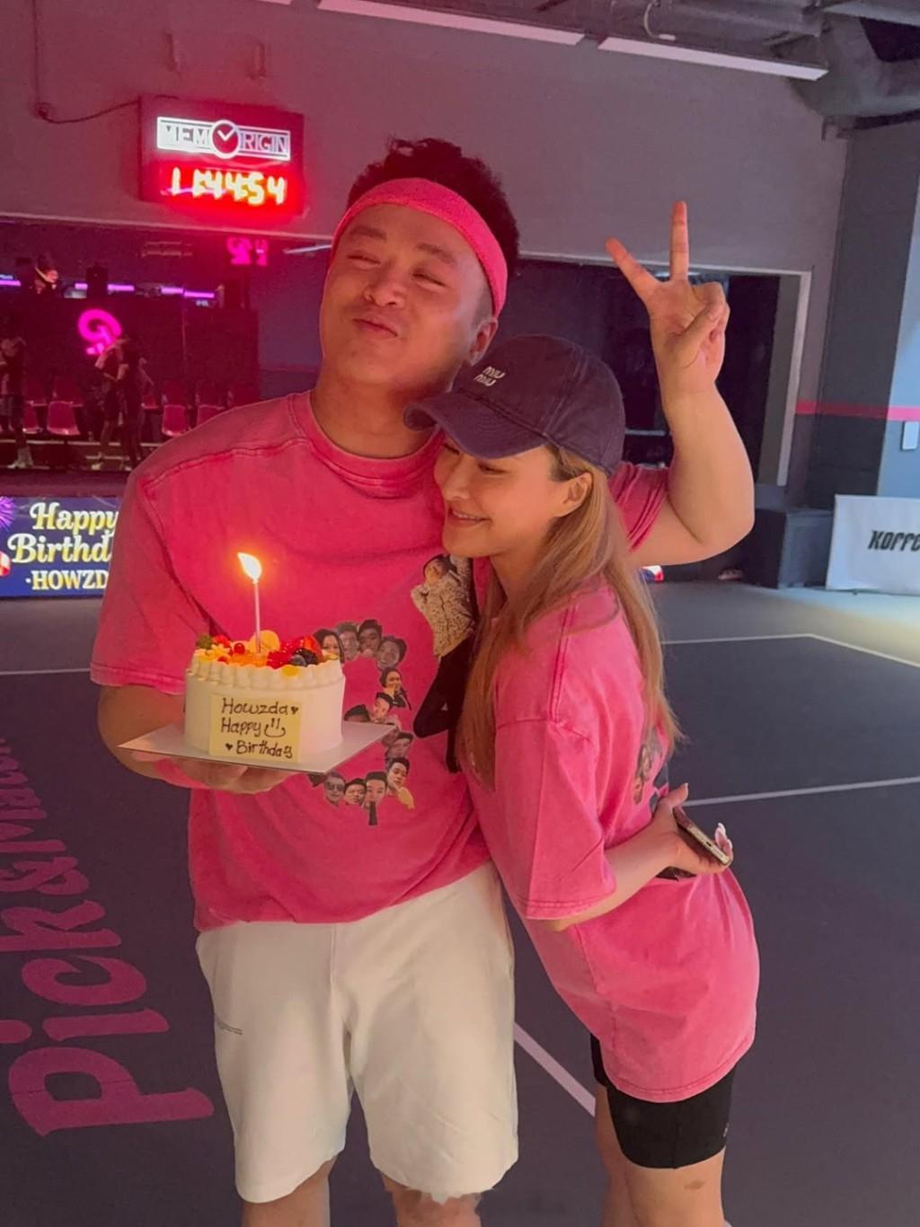 另外一张引起热话的,就是陈滢跟一名男士庆生的照片。图中二人分别穿起粉红色同款情侣装T恤,男士右手手持生日蛋糕,左手举起V字手势表情甚为"得意",而陈滢在旁就和他极度亲密,甚至出现胸压的情况,难怪男子眯眼嘟嘴极为享受。生日蛋糕上面写上HOWZDA Happy Birthday,原来这名男子正是陈滢绯闻男友Howie。