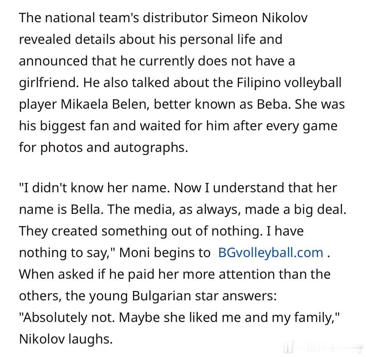 保加利亚国家队排球运动员西美昂·尼科洛夫透露了他的个人生活细节,并宣布他目前没有女朋友。他还谈到了菲律宾排球运动员米凯拉·贝伦。