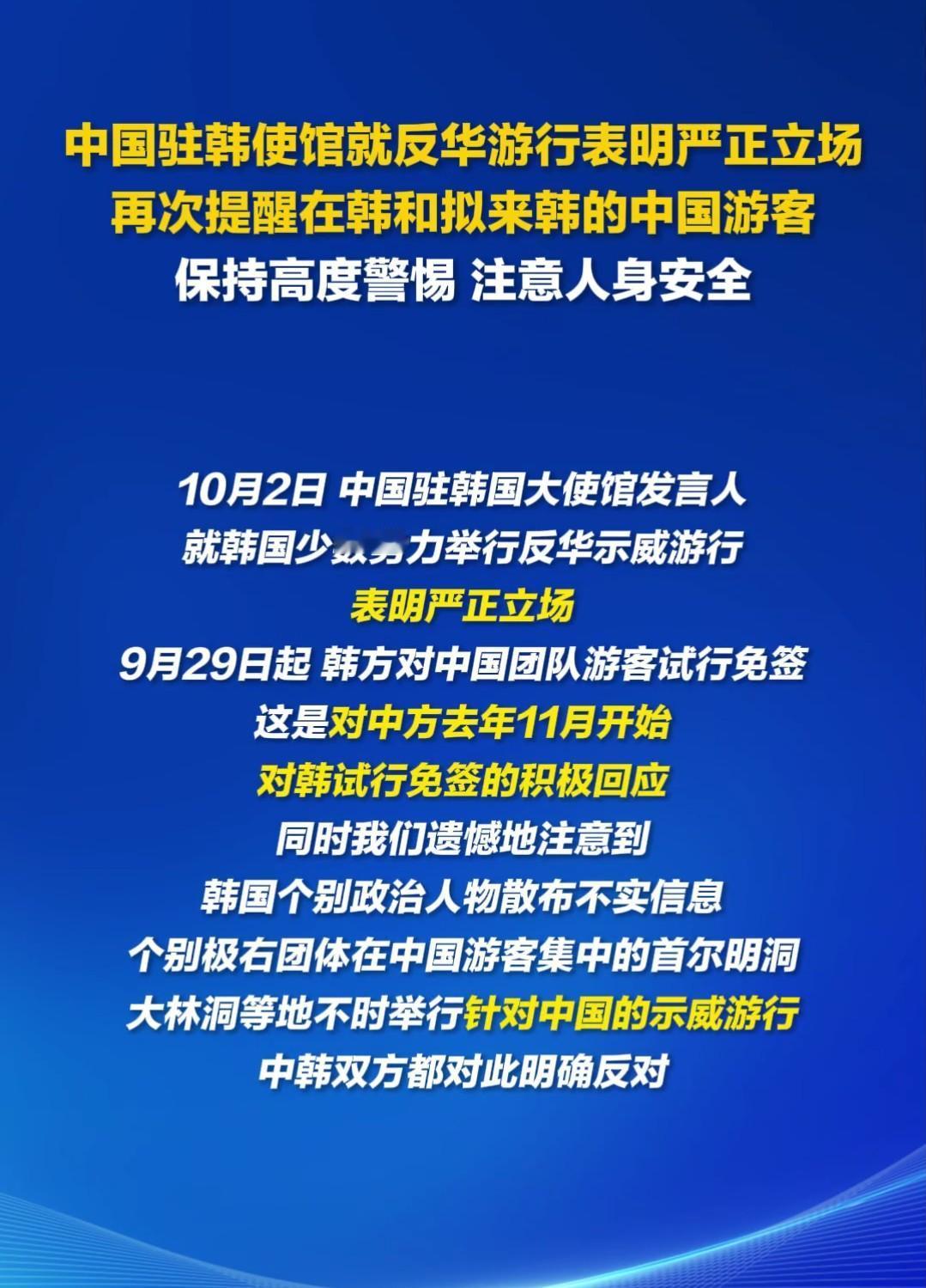 10月3日,韩国首尔爆发反华大游行,组织者号称“不欢迎中国人。” 韩国极右翼势力要在韩国首尔市中心举行反华游行,中国驻韩大使馆紧急提醒在韩国的中国游客,保持高度警惕,注意人身安全。 此前,在9月29日,韩国对中国3人以上团体进行免签政策出来以后,就有极端的韩国人在网上发表要言论“表示要拿刀捅中国人”,甚至有人言论更为激烈,还引起韩国警方的注意。 甚至有人说,看到有韩国人在外网说,他们非常讨厌中国人去韩国,但是有些人就是没自尊,喜欢往韩国跑! 韩国人的行为和说的话都很让人扎心,所以想问问某些中国人,不去韩国就不行么?非得舔着脸去让人说,还花钱。中国的大好河山,哪里旅游不是旅游。