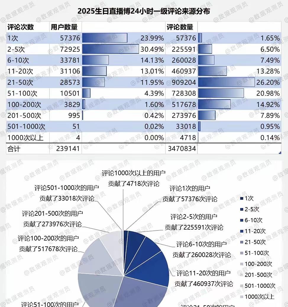 明星生日粉丝评论统计! 这数据,周深简直是断层领先呀![石化] 确定他只有1000多万粉吗? 好多明星的粉丝比他多的多,怎么送祝福的钻粉却少得可怜? 难道都不是活人? 周深的生日直播间,有29.49%评论竟然是路人发布的! 能吸引路人驻足观看直播并评论,这就是周深的实力! 最近,看见很多说,明年大湾区晚会应该不会再请周深了! 我知道这类传谣者的想法噢![偷笑] 因为,周深参加的直播晚会,会让其他歌手压力巨大! 周深的直播表现,每回都是一鸣惊人! 自认为现场表现已经发挥到极致的歌手,一遇见周深,同样会黯然失色! 有很多歌手都觉得,周深不参加,自己才有活路![流泪] 记住!希望他不参加的,都是这类歌手的粉丝! 像这类晚会,参不参加,还得央妈说了算! 如还敢继续造谣,那央妈所做的下一碗闭门羹,就是送给你家大佬的![比心]