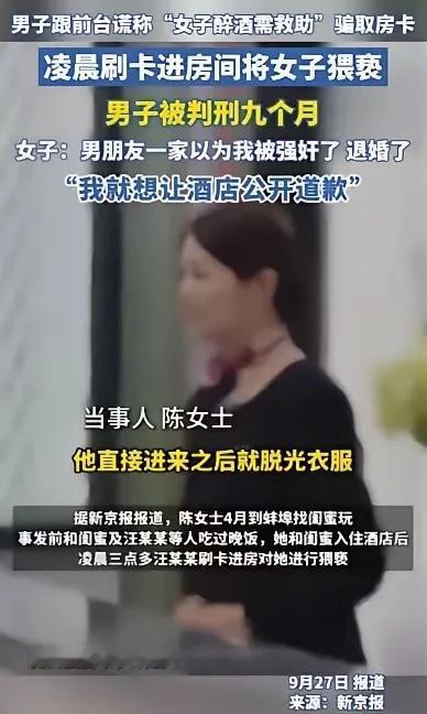 彻底解释不清了!9月安徽,一女子同闺蜜及其男朋友等几人在KTV消遣后,闺蜜带着女子一起开房休息,然而谁也没想到,凌晨时分,闺蜜的男性朋友脱光衣服钻进女子的被窝里面,对女子进行了伤害…… 安徽蚌埠某派出所的调解室里,陈女士拿着未婚夫的退婚协议,手指因用力而发白——协议上“因女方个人原因导致婚约无法继续”的字样,像针一样扎进她心里。 10天前,她在酒店被闺蜜的朋友汪某侵犯,如今施暴者已被判刑,可最该站在她身边的两个人: 未婚夫说她“不干净”,闺蜜竟劝她“别闹大,影响大家名声”,而这一切的源头,只是酒店前台轻易交出的那枚房卡。 事发当晚,陈女士在KTV就察觉汪某不对劲:对方借敬酒之名故意碰她的手,还凑在她耳边说“你比李某漂亮多了”。 陈女士当场躲开,还拉着李某到角落提醒“你朋友有点过分,我想早点走”,可李某却笑着打圆场:“他就是喝多了嘴碎,你别往心里去,等会儿我送你回酒店。” 正是这份“轻信”,让陈女士一步步走进了噩梦。 凌晨3点,汪某拿着酒店房卡打开陈女士的房门时,她还在睡梦中。 直到对方钻进被窝,她才惊觉反抗,挣扎中抓伤了汪某的胳膊,还没等她喊出声,汪某就捂住她的嘴威胁“再叫我就对你不客气”。 万幸的是,陈女士提前把手机放在枕头边,摸到手机后立刻给李某发了定位和“救命”消息,李某赶来时,汪某正试图压制她的反抗。 可让陈女士没想到的是,李某第一反应不是安慰她,而是拉着汪某到走廊“私聊”,回来后竟劝她:“汪某说他不是故意的,就是喝多了认错人,要不这事就算了?报警的话,传出去对你名声不好。” 陈女士不敢相信自己的耳朵:“他都闯进我房间了,你还帮他说话?” 争执间,陈女士的未婚夫打来电话,李某抢过手机说“没事,就是点小误会”,却在挂电话后劝陈女士“别告诉你未婚夫,男人都在意这个”。 可纸终究包不住火。未婚夫从朋友口中得知消息后,连夜赶到酒店,见面第一句话就是“你到底有没有被他怎么样?” 陈女士哭着解释经过,他却皱着眉打断:“现在说这些有什么用?别人知道了,我爸妈怎么抬得起头?” 第二天,退婚协议就送到了陈女士手上,无论她怎么解释“我是受害者”,对方只回复“我没法接受这样的你”。 更让陈女士寒心的是酒店的态度。警方调查发现,汪某能拿到房卡,全靠酒店销售经理的“人情操作”: 汪某先是以“朋友醉酒需要照顾”为由找前台要房卡,被拒绝后拨通了李某的电话,让李某跟销售经理说情,经理竟直接绕过“需住客本人确认”的规定,让前台把房卡交给了汪某。 面对质疑,酒店起初说“是前台操作失误”,后来又改口“汪某提供了有效身份证明”,直到陈女士的律师拿出监控录像,酒店才勉强承认“存在管理漏洞”,却只愿补偿“3天免费住房”,绝口不提道歉。 好在,陈女士没有被彻底打垮。她在网上分享了自己的经历,意外得到了很多网友的支持:有律师主动联系她,帮她整理酒店违规的证据; 有同样遭遇过酒店安全问题的网友,分享维权经验;还有心理医生免费为她提供疏导。 在大家的鼓励下,陈女士决定起诉酒店,要求公开道歉并整改安全制度。 如今,陈女士已经离开蚌埠,在朋友的帮助下找了一份新工作。 每天下班后,她会去公园散步,或者跟支持她的网友聊天,慢慢走出阴影。 她的律师正在准备起诉材料,而那家酒店,在文旅部门的督促下,出台了“访客需住客本人到场确认”“前台不得私自放房卡”等新规,但始终没给陈女士一句正面道歉。 至于闺蜜李某和前未婚夫,陈女士已经拉黑了他们的联系方式:“我不需要不站在我这边的人,以后的路,我自己走也能走得很好。” 这场由房卡引发的悲剧,让陈女士失去了爱情和友情,却也让她学会了坚强。她常说:“错的不是我,我没必要为别人的恶行买单。” 而她的经历,也给所有人提了个醒:酒店的安全不能靠“人情”,朋友的信任不能无底线,爱人的支持更不该附加“条件”——真正的正义,不仅是让施暴者受罚,更是让受害者能挺直腰杆,重新拥抱生活。 信息来源:女子入住安徽蚌埠一高端酒店,凌晨却在房间内遭男子强制猥亵,当事人:男子从前台获取房门卡2025-09-27 15:29·极目新闻