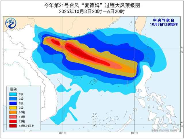 大风预报:3日夜间至6日白天,广东雷州半岛和中西部沿海、广西沿海、海南岛及沿海、西沙群岛、中沙群岛、黄岩岛附近海域将有6到8级风,南海中北部、琼州海峡、北部湾中北部有9到11级风,“麦德姆”中心经过的附近海域或地区风力可达12到14级、阵风15到17级。