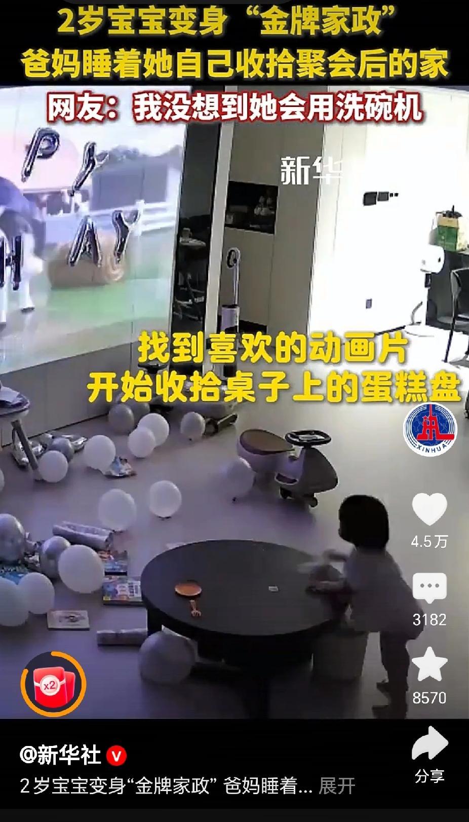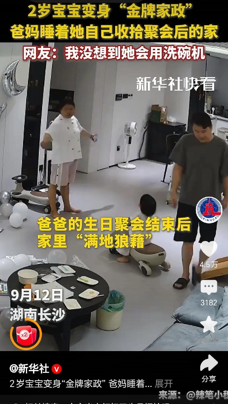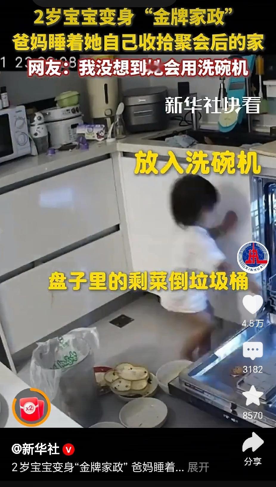 “满级了,2岁宝宝半夜将家里打扫的干干净净!”近日,湖南长沙,一家生日宴过后,家里满地狼藉,没想到刚满两岁的孩子半夜起来将家里收拾的整整齐齐,得到了新华社的转发点赞!(来源:@新华社V) 据报道,家里男主人生日宴过后,垃圾遍地,第二天一起来男女主人惊呆,原来杯盘狼藉的,家里变得干净整洁! 打开监控一看,原来昨天晚上打扫卫生“田螺姑娘”是自己刚满两岁的孩子!当天由于太晚了,女主人也没有精力打扫了。爸爸妈妈对孩子说,“今天累了一天,我们就不打扫卫生了,明天再来,先睡觉吧!” 到半夜,孩子的爸爸妈妈睡着了,孩子爬起来,开启了她“金牌家政宝宝“的行程。只见宝宝先将桌上的剩饭剩菜倒入垃圾桶,然后将碗筷收拾进洗碗机。 收拾了桌子上,接下来就清理地面,孩子将地板上的气球一个一个的捡起来,放到门后边去了。接着又操作起吸尘器,将地面打扫的干干净净。 孩子将整个家里收拾干净了,爬到床上左右两边各亲了爸爸妈妈一口,然后放到被子里,美美的睡着了。 “这也太震惊了吧!”有网友评论道,两岁的孩子会用洗碗机,这个我没有想到,这真的是个小天使呀! “这样的孩子有行动力,有担当!”更有网友说,有爱心能做事,能成事,未来是社会真正的主人翁! “还是爸爸妈妈平常言传身教的好!”有网友说,这说明平时父母爱收拾,常常全屋非常整洁。还说明宝宝平时住有很好的洞察力,以及动手能力。 是呀,父母就是孩子的第一任老师,父母的言行为孩子做出良好的榜样和示范,这样孩子在成长的过程当中就会有好的习惯和能力! 对此,你的看法是怎样的呢? 2岁孩子半夜收拾家里 @秋实99 关注人生冷暖,拥抱幸福生活。