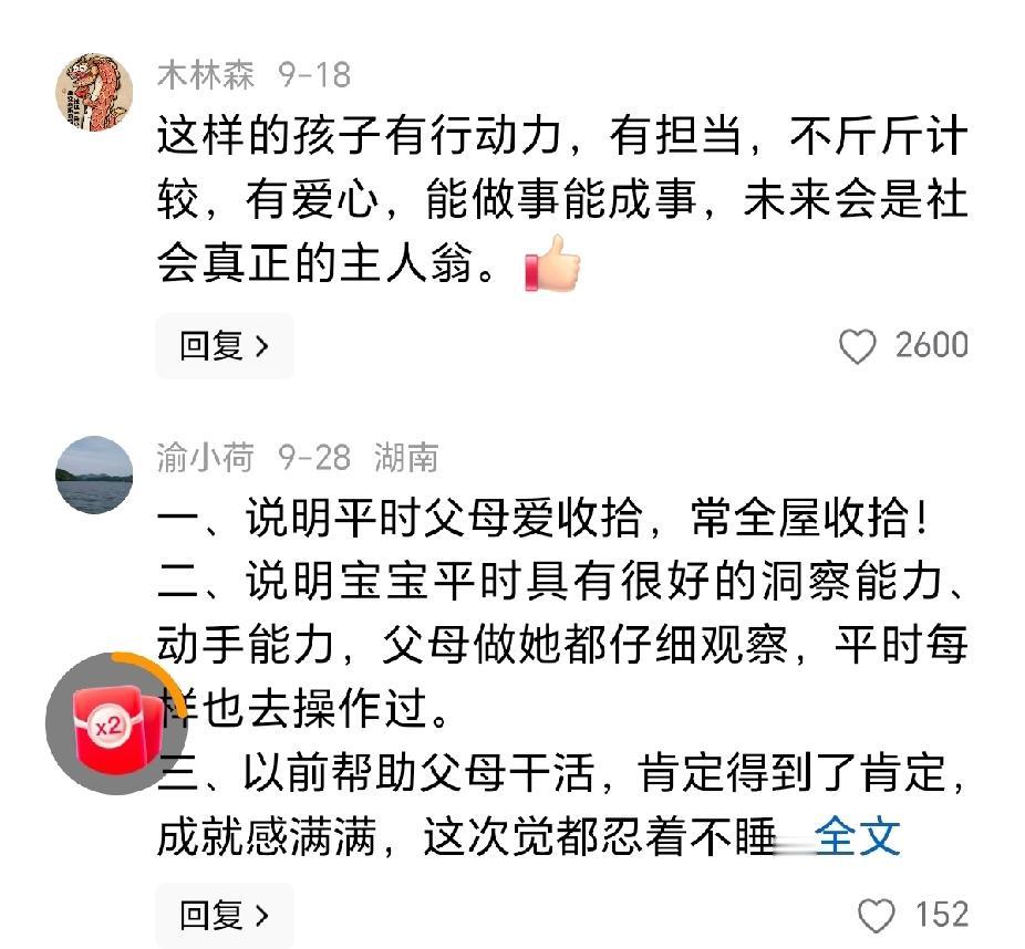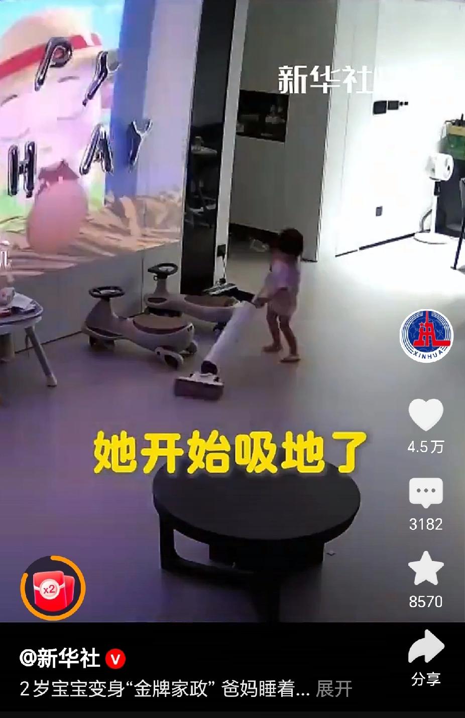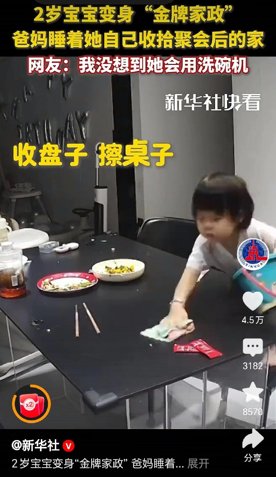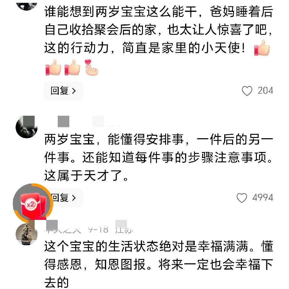 “满级了,2岁宝宝半夜将家里打扫的干干净净!”近日,湖南长沙,一家生日宴过后,家里满地狼藉,没想到刚满两岁的孩子半夜起来将家里收拾的整整齐齐,得到了新华社的转发点赞!(来源:@新华社V) 据报道,家里男主人生日宴过后,垃圾遍地,第二天一起来男女主人惊呆,原来杯盘狼藉的,家里变得干净整洁! 打开监控一看,原来昨天晚上打扫卫生“田螺姑娘”是自己刚满两岁的孩子!当天由于太晚了,女主人也没有精力打扫了。爸爸妈妈对孩子说,“今天累了一天,我们就不打扫卫生了,明天再来,先睡觉吧!” 到半夜,孩子的爸爸妈妈睡着了,孩子爬起来,开启了她“金牌家政宝宝“的行程。只见宝宝先将桌上的剩饭剩菜倒入垃圾桶,然后将碗筷收拾进洗碗机。 收拾了桌子上,接下来就清理地面,孩子将地板上的气球一个一个的捡起来,放到门后边去了。接着又操作起吸尘器,将地面打扫的干干净净。 孩子将整个家里收拾干净了,爬到床上左右两边各亲了爸爸妈妈一口,然后放到被子里,美美的睡着了。 “这也太震惊了吧!”有网友评论道,两岁的孩子会用洗碗机,这个我没有想到,这真的是个小天使呀! “这样的孩子有行动力,有担当!”更有网友说,有爱心能做事,能成事,未来是社会真正的主人翁! “还是爸爸妈妈平常言传身教的好!”有网友说,这说明平时父母爱收拾,常常全屋非常整洁。还说明宝宝平时住有很好的洞察力,以及动手能力。 是呀,父母就是孩子的第一任老师,父母的言行为孩子做出良好的榜样和示范,这样孩子在成长的过程当中就会有好的习惯和能力! 对此,你的看法是怎样的呢? 2岁孩子半夜收拾家里 @秋实99 关注人生冷暖,拥抱幸福生活。