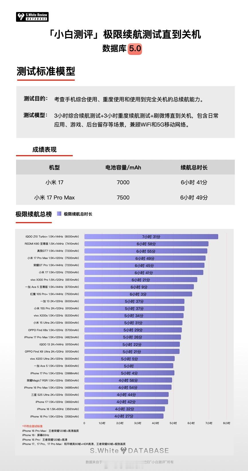 小米17系列销量破100万,已经入手后的小伙伴实际续航怎么样?下面是数据库5.0模型下实测其中两款的成绩: