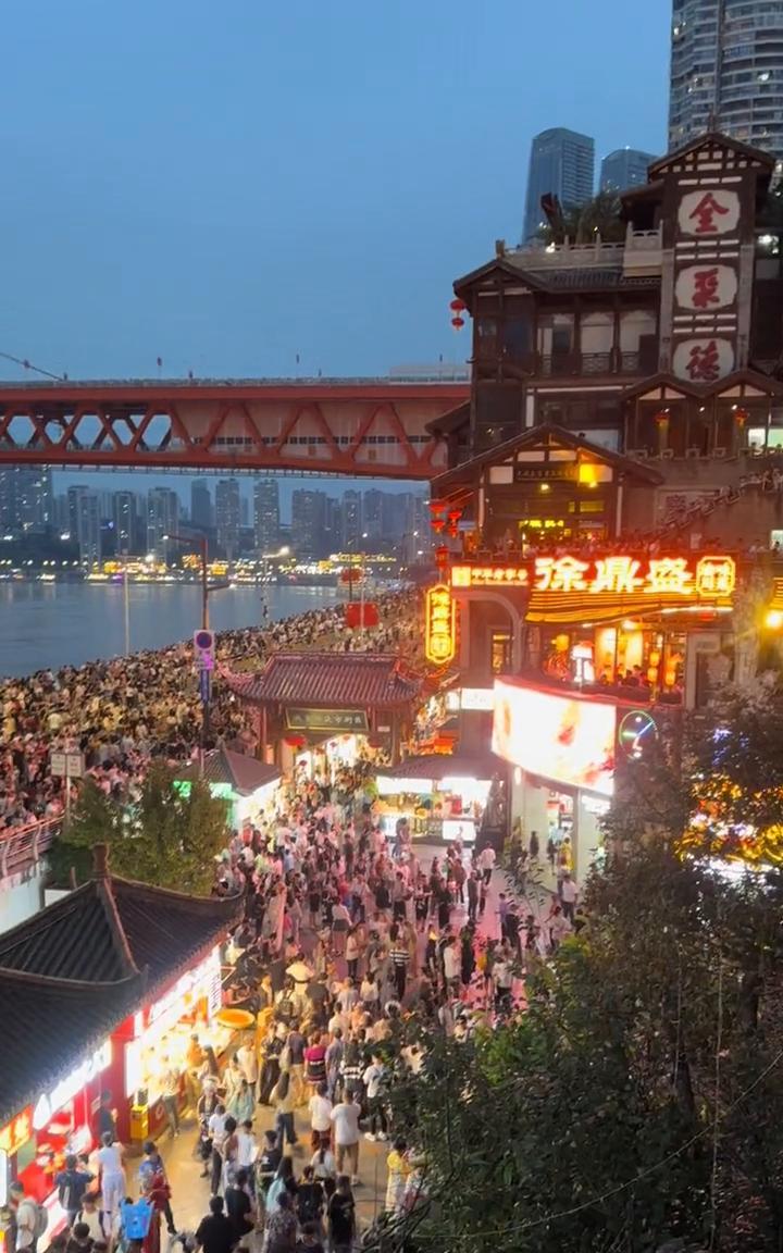 还有十五分钟亮灯,重庆洪崖洞。全都是等着看开灯仪式的,七点钟亮灯,全都是人,大家看一看。