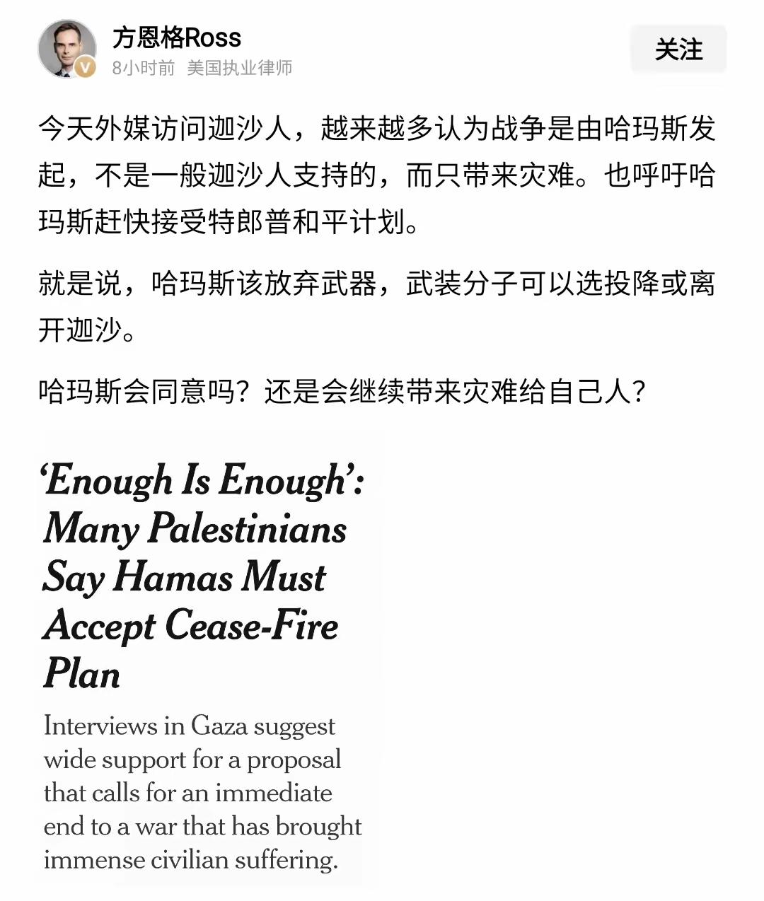 确实和当年侵华日军的口吻一模一样 网友评论: 那些老百姓本来是因为加沙经济繁荣(繁荣是因为从前有以色列定居点)去混饭吃,结果现在成了战地。也许在他们眼里无论谁赢,能安稳过下去就行。 既然哈马斯这么恐怖,我建议犹太人离开中东,让你们的上帝再造一块陆地去生活吧! 呵呵,犹太人真是厉害啊,别人投降他要炸别人,逼得别人打,然后污蔑别人要反抗