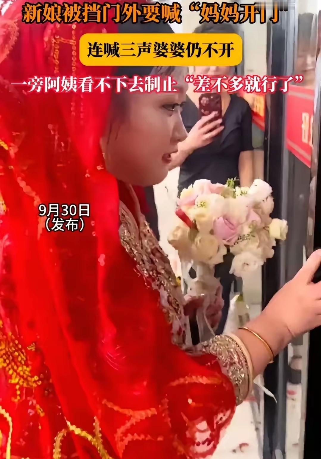 新媳妇穿着大红嫁衣刚到婆家楼下,就瞅着大门关得严严实实,婆婆压根没露面。她没法子,只能隔着门脆生生喊了三声“妈妈开门”,可门里半点动静没有。 旁边看热闹的阿姨们都替她着急,有个热心的直接上前,一边推门一边劝:“差不多得了,大喜的日子别僵着!”门开后大家才知道,这是当地婚俗,喊门是让新娘认门改口,之后婆婆会给1001或10001的改口费,图个“千里挑一”的好彩头 。 但有些时候,新娘喊完三声,婆婆还故意不开门,非得等亲戚劝几句才“不情愿”地露面,这就有点变味了。结婚本是高高兴兴的事,搞这些没必要的场面,要是遇上个脾气直的新娘,当场撂挑子多尴尬。 我觉得,婚俗讲究的是心意,不是要拿捏谁,互相尊重才是过日子的根本。你们那儿结婚有啥特别的习俗?要是遇到这种“喊门”的情况,你们会咋处理?