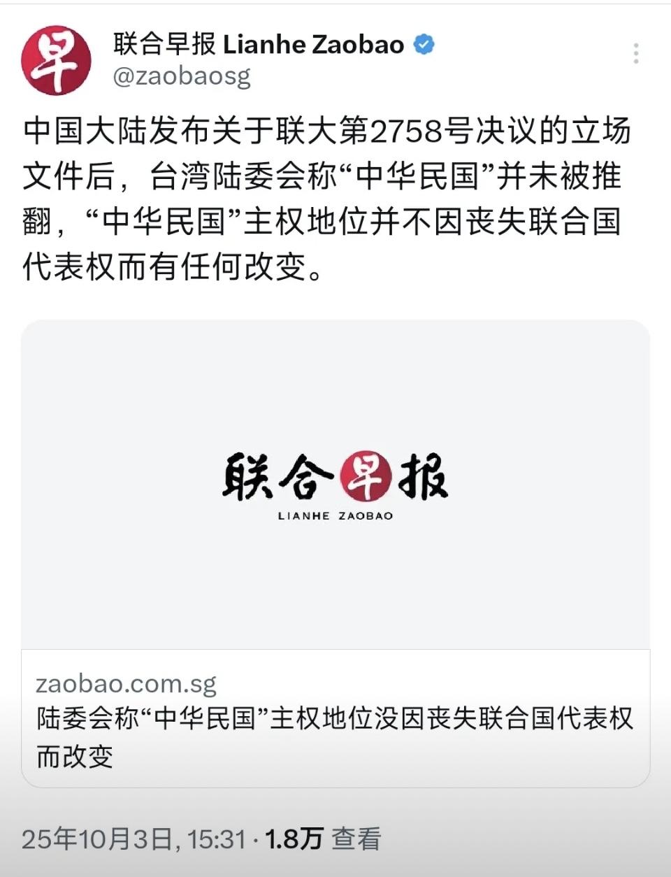 陆委会还在嘴硬?2758号决议早把“主权谎言”钉死了! 大陆刚发联大2758号决议立场文件,台湾陆委会就急着喊“‘ 中华民国’主权没丢”,这话说得何止是荒谬,简直是连基本事实都懒得顾了。 1971年那纸决议写得明明白白,恢复中华人民共和国在联合国的一切权利,把蒋介石集团的代表赶出去,这从法律上彻底解决了中国代表权问题。联合国官方文件里,台湾从来都是“中国的省”,秘书处早就明说台湾没有独立地位。现在全世界183个国家都认一个中国,陆委会却闭着眼说“主权不变”,这不叫自欺欺人叫什么? 他们无非是想混淆视听,骗台湾同胞“有主权”,可国际社会的眼睛是亮的。当年搞“双重代表权”都没成,现在还想翻案?根本是痴人说梦。 这种连联合国决议都不认的言论,真能骗到人吗?你觉得这是自欺还是欺人?