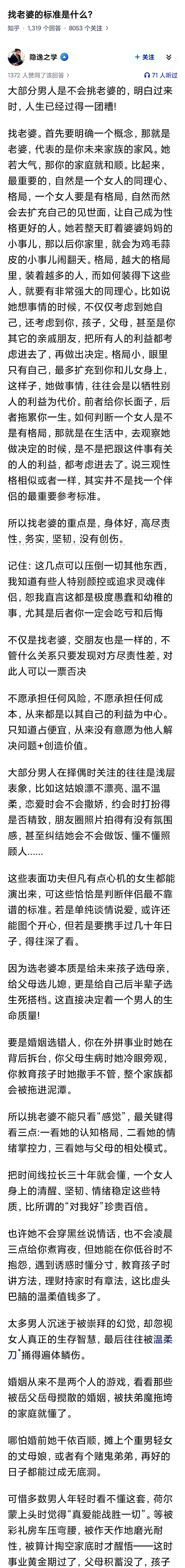 找老婆的标准是什么? 千言万语一句话:找个契约精神强的。 年纪轻的可能理解不了,