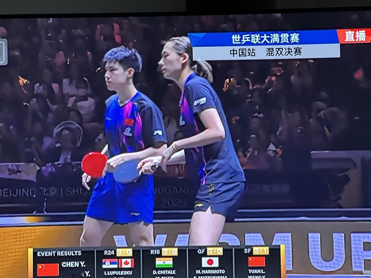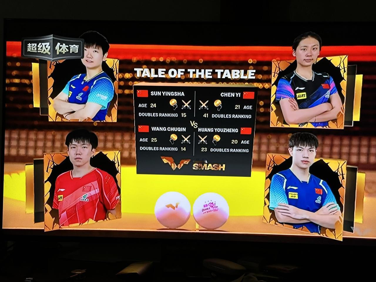 北京时间2025年10月3日晚上9:00多钟,WTT中国大满贯混双决赛在中国队的两个组合中巅峰对决,一决高下, 他们分别是王楚钦孙颖莎组合与黄友政陈熠组合。 21:06,决赛的第一局正式开始: 莎头组合先发球,陈熠组合先得1分, 莎头也得一分 二比二平, 三比二,陈熠组合暂时领先一分, 三比三, 四比四,你追我赶,谁也不甘落后! 五比四,莎头开始领先, 五比五,开局的十个球打得太精彩了! 六比五,莎头领先, 七比五,莎头领先2分, 七比六, 八比六, 九比六, 10比八, 11比8,王楚钦孙颖莎组合拿下了第一局! 比赛正在进行,快来看直播吧 ——