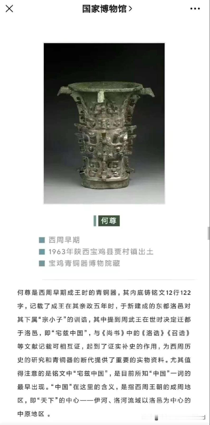 何尊铭文的解读不要再拿老黄历说事。 某地网友常发国博馆的何尊介绍, 特别是宅兹中国, 指洛阳地区。 可是,为什么不看看国博馆新的介绍呢 历史的认知在实际考古中得到修正, 使得人们对历史的了解更贴近历史真相 这也是考古的现实意义。 那么,国博馆为什么对何尊的介绍, 宅兹中国进行删改, 去掉了宅兹中国指洛邑地区呢? 主要原因是: 国博馆最新何尊介绍, 去掉“最早的中国”指洛邑的说法, 主要是因为学术界, 对何尊铭文中“中国”的所指, 存在不同观点, 且新的研究和考证更倾向于, 认为“中国”指的是丰镐地区而非洛邑。 何尊铭文记载, “唯武王既克大邑商, 则廷告于天, 曰: ‘余其宅兹中国,自之乂民’” 一些学者认为, 武王克商时, 洛阳城尚未形成, 还在建设之中, 周武王不可能, 将一个尚不存在的地方称为“中国”, 而丰镐是周武王的都城, 拥有广泛的历史共识, 因此,铭文中的“中国”应指丰镐。 此外,从何尊铭文的时序来看, 周公主持的雒邑工程, 始自成王五年三月二十一日, 而何尊所述“成王宅于成周”, 发生在营建洛邑启动后的第25天, 此时雒邑尚处于地基开挖阶段, 不可能存在“京室”建筑, 也不符合“廷告于天”的条件。 况且,成周早于雒邑, 三监之乱中就提到欲攻成周, 而此时洛邑根本不存在。 但成周的出现, 比洛邑早了10年。 所以,何尊铭文中的, 唯王初雍,宅于成周, 根本不是指洛邑。 基于这些新的研究和观点, 博物馆在介绍何尊时, 为了避免争议, 或更准确地反映学术研究的现状, 而去掉了, “最早的中国”指洛邑的相关表述。 同时增加了丰镐。 西工大的何尊赋, 对其最早的中国有明确的指向。 认为最早的中国, 指周王所在的丰河两岸。 而国博馆对何尊宅兹中国的修订, 更符合历史教科书对何尊的表述。 武王灭商,建立周朝, 要在“天下之中”定都。 而武王定都镐京, 不言而喻的解释了, 最早的中国是镐京。
