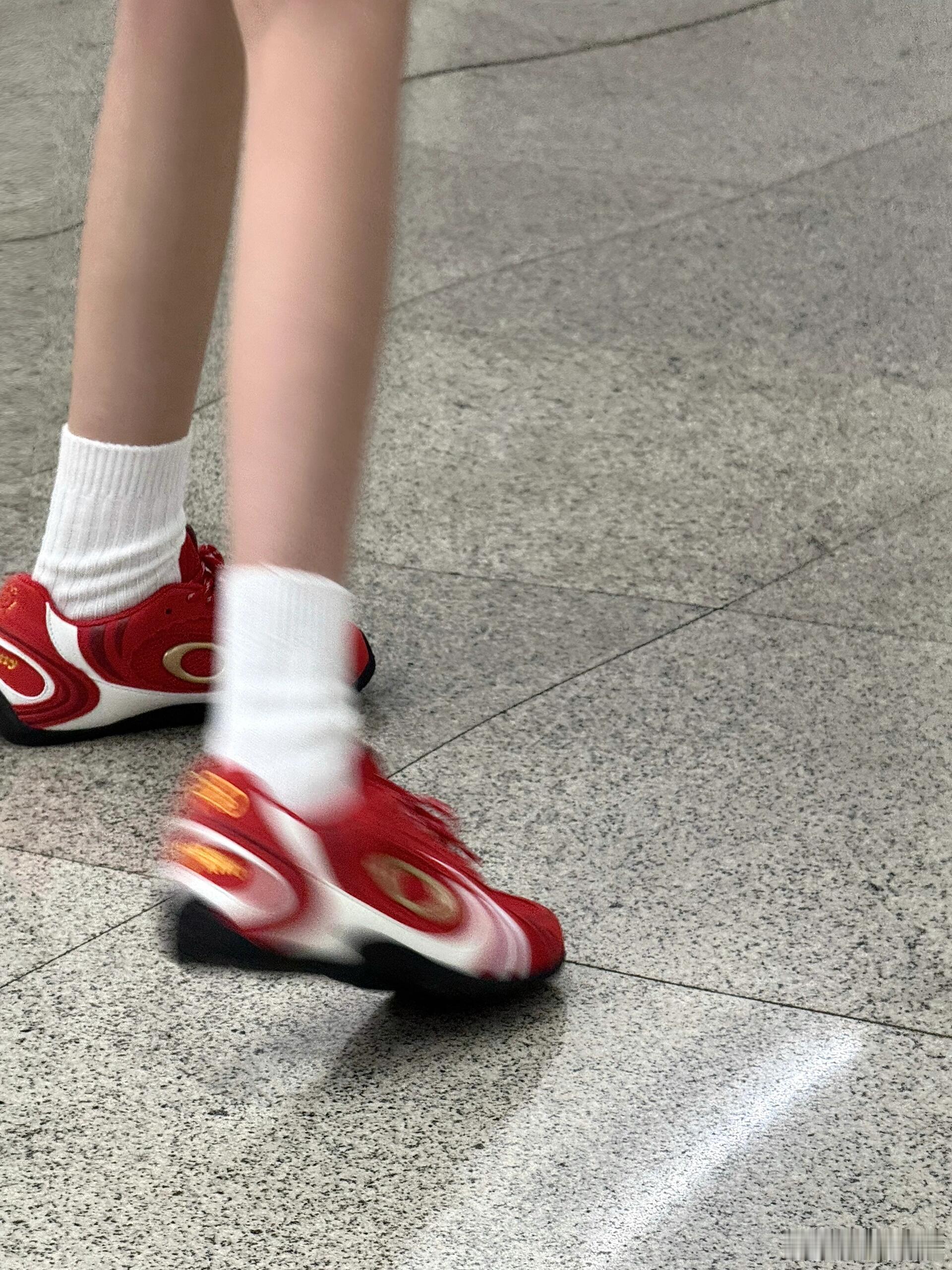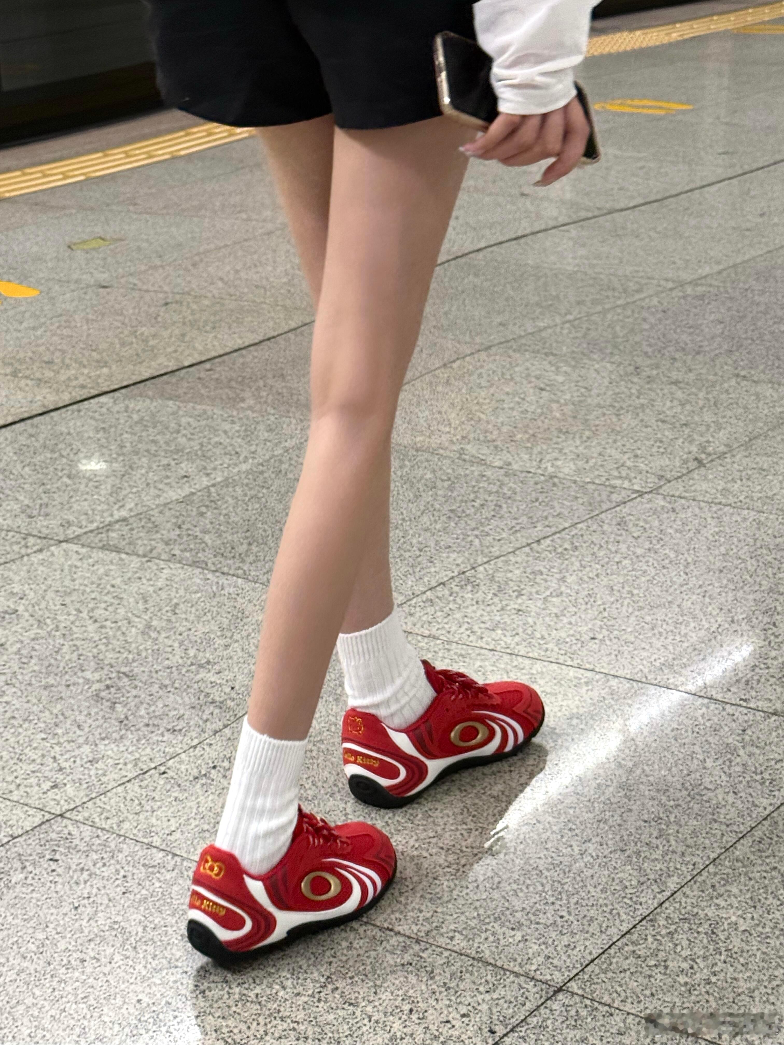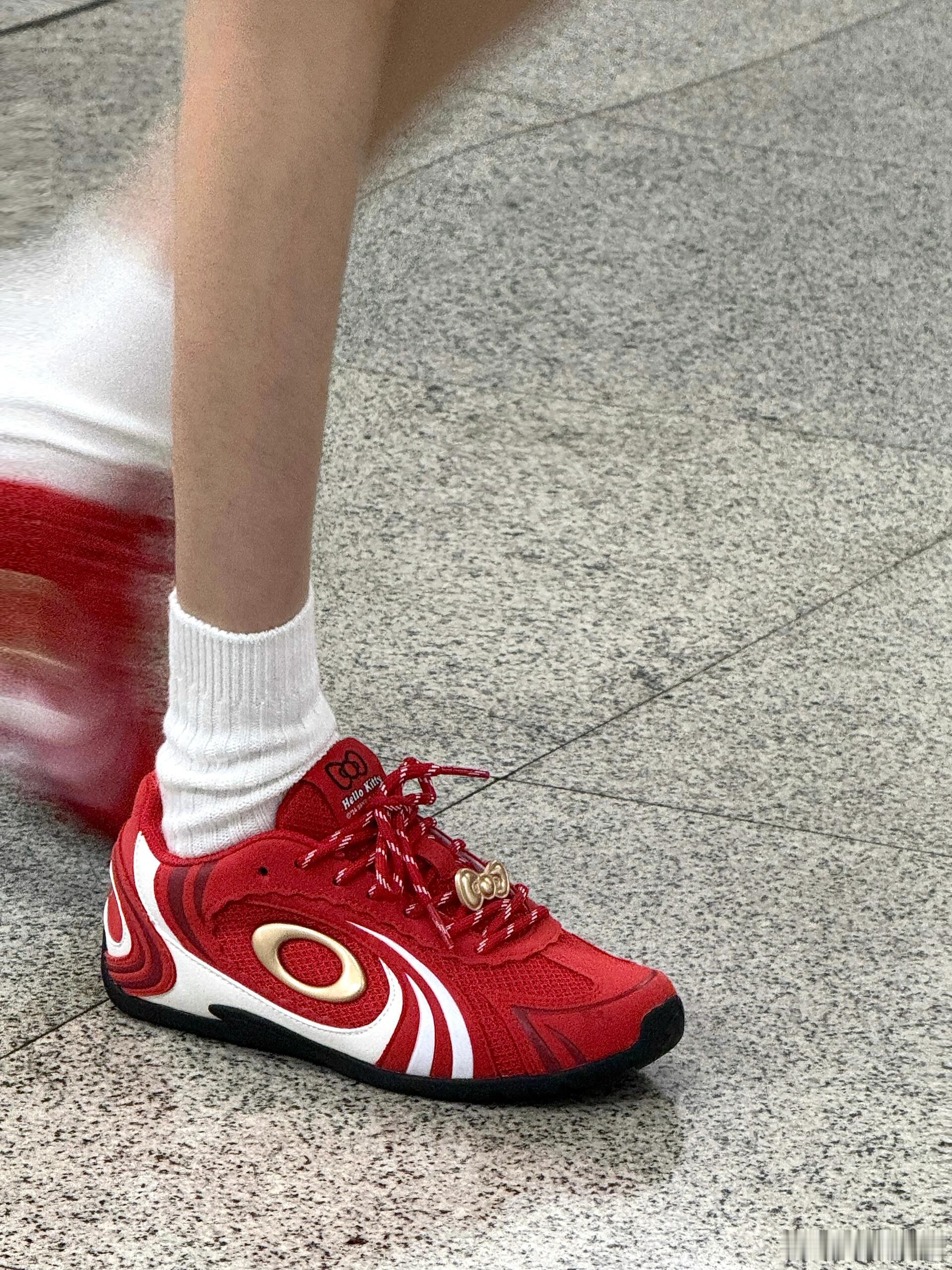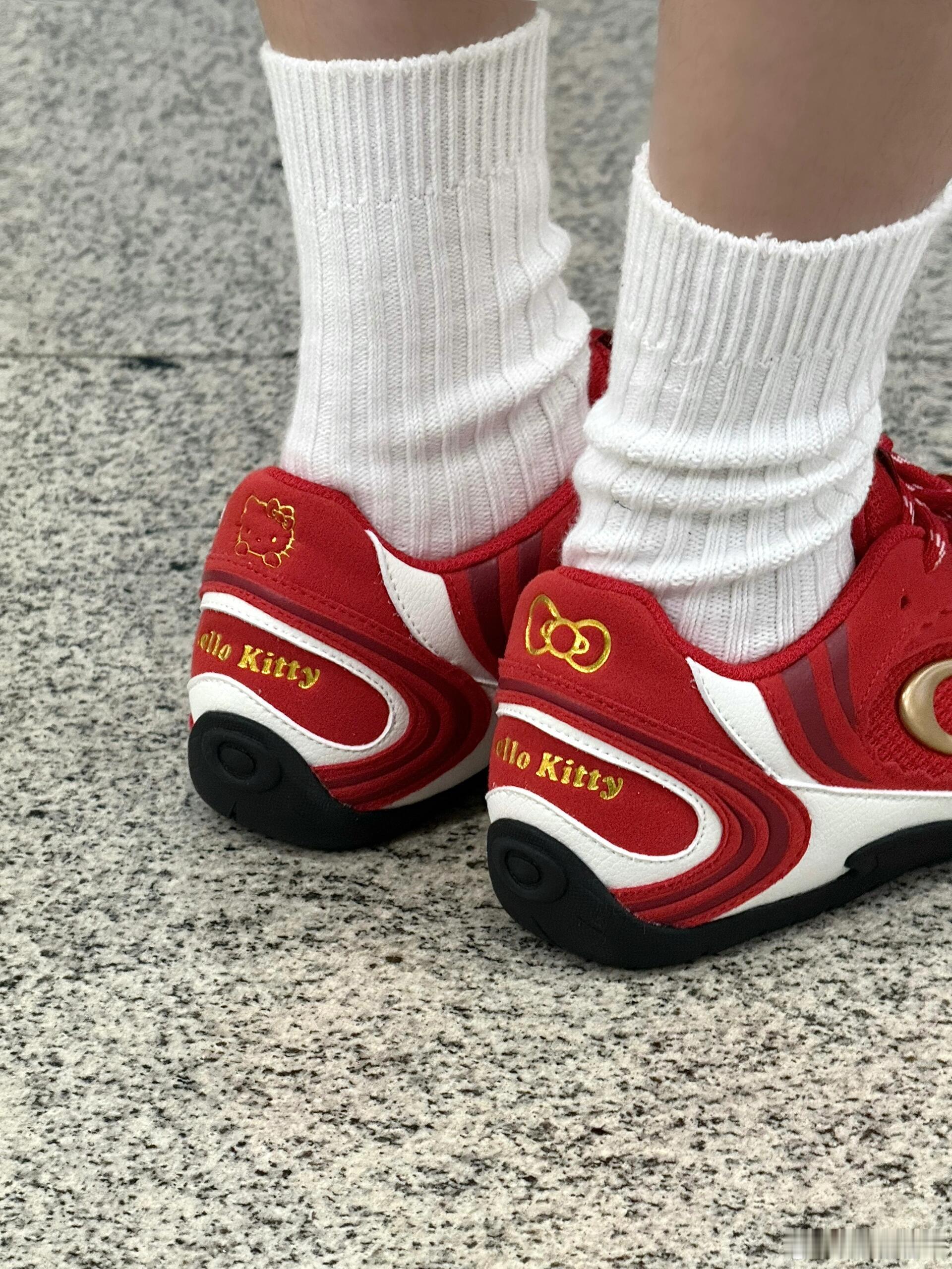 整体红、白、灰的配色方案对比鲜明,风格既活泼又现代。它成功地将运动休闲的动感线条与Hello Kitty的甜美魅力相结合,搭配简约的白色短袜,展现出独特的个性穿搭,无疑是潮流爱好者打造吸睛造型的点睛单品。时尚鞋履SOTD鞋控的日常