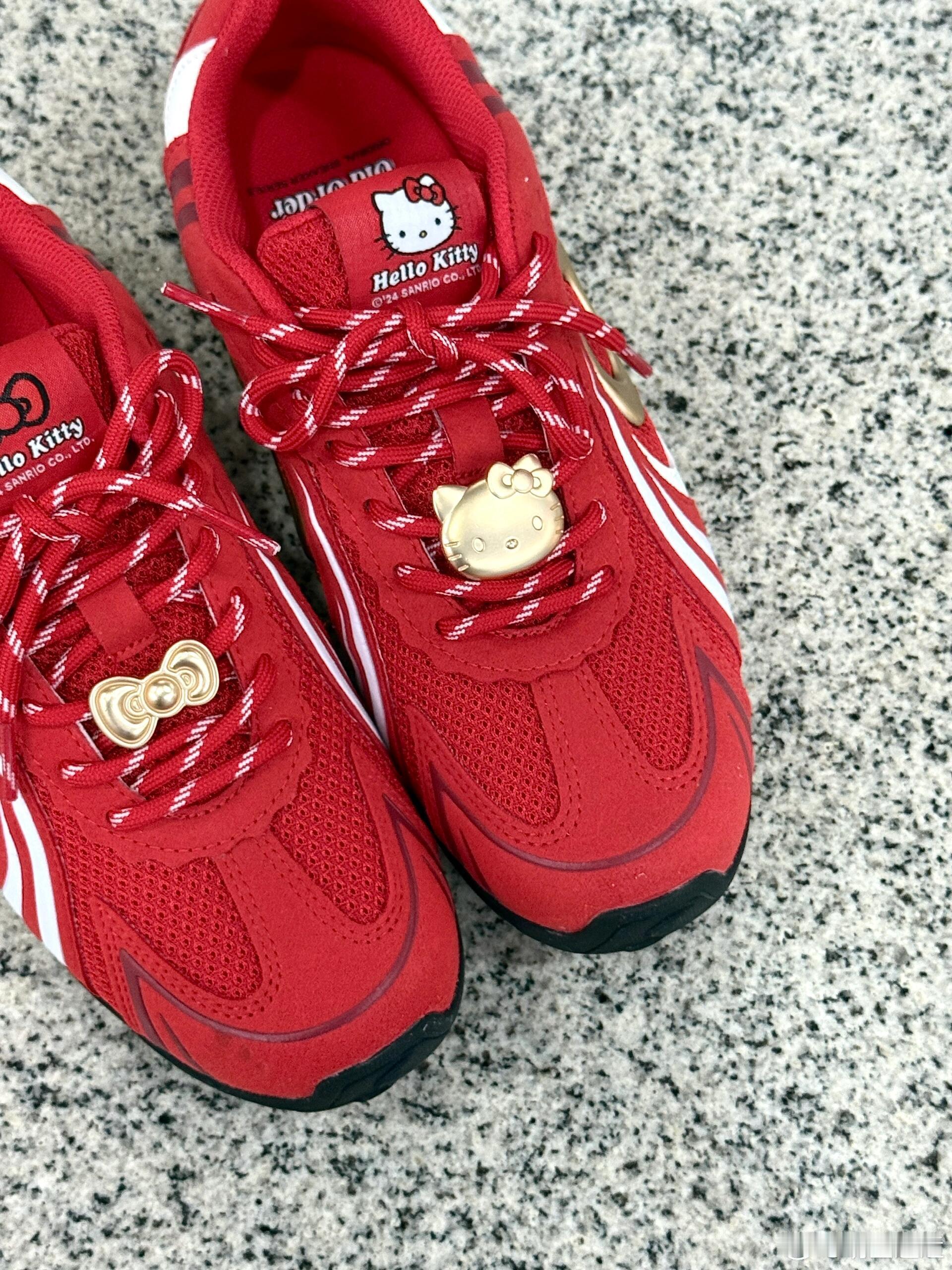 这双运动鞋以鲜艳的红色为主色调,鞋面饰以流畅的白色条纹,瞬间营造出热情而充满活力的视觉冲击。其最大的设计亮点在于鞋舌上醒目的“Hello Kitty”标志,以及鞋带孔处点缀的精巧金色蝴蝶结配饰,巧妙地将经典卡通形象的可爱基因注入运动风范之中。背景的灰色大理石地面纹理,进一步衬托出鞋品的时尚与精致感。