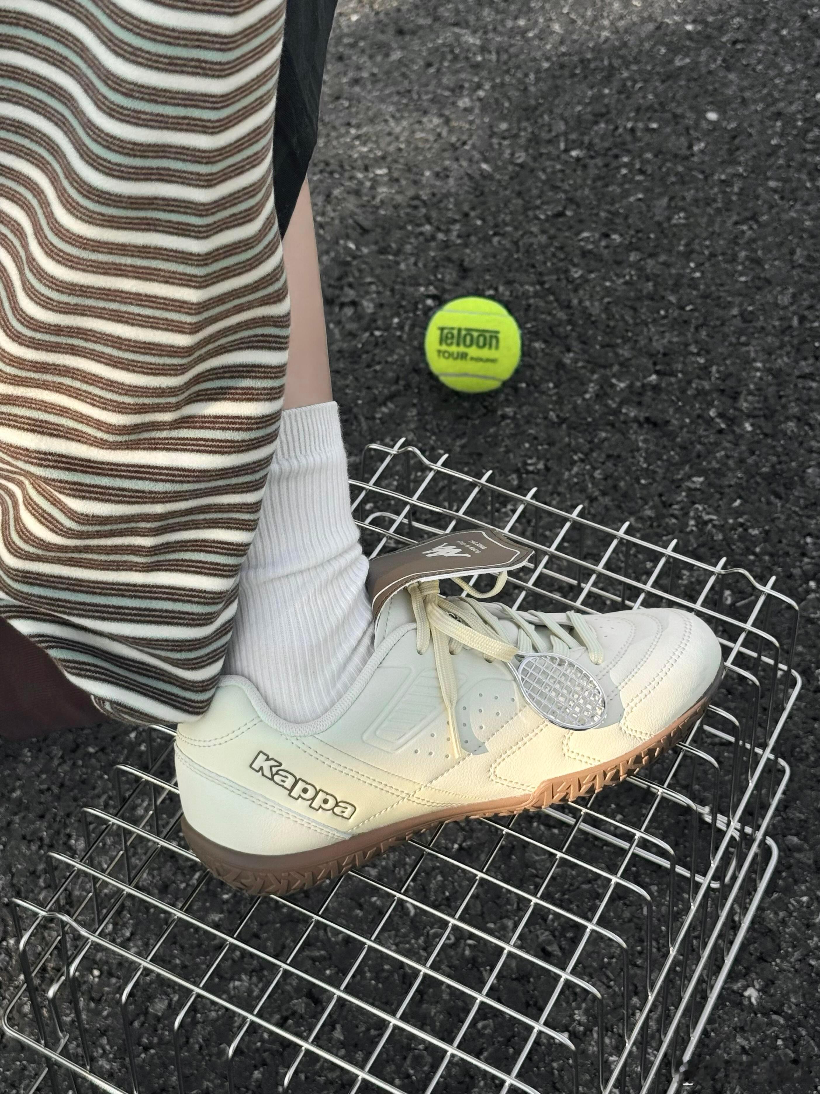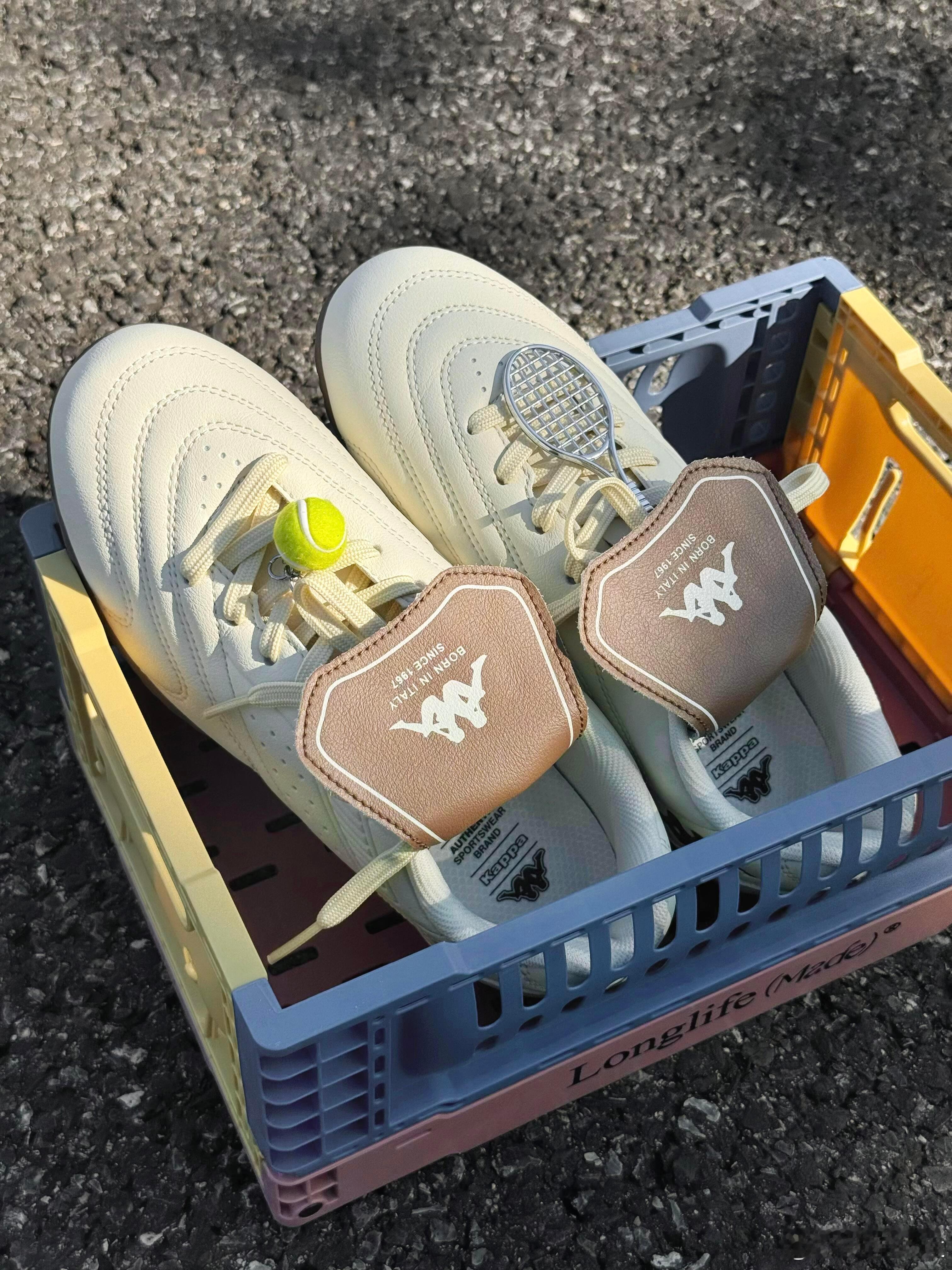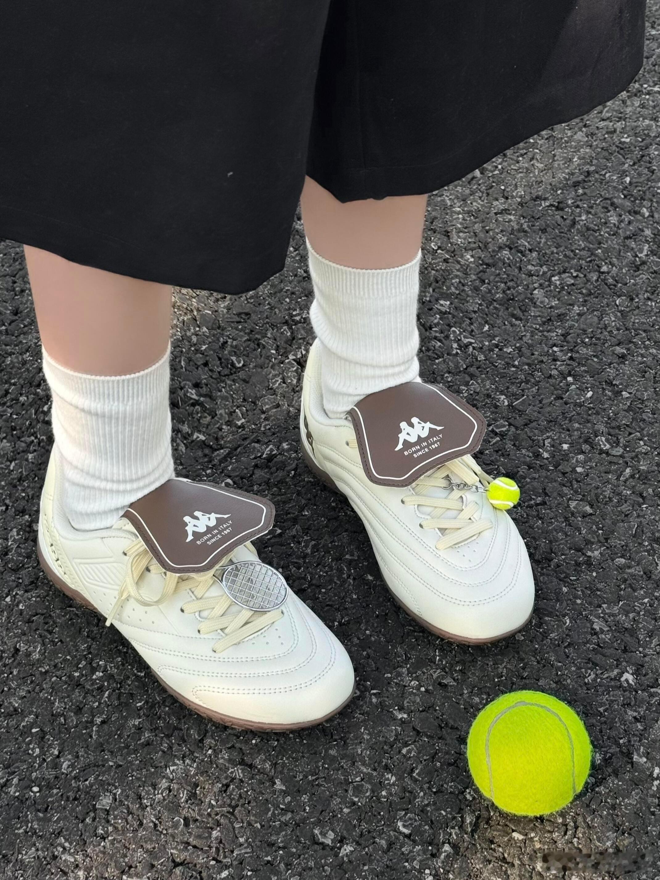 这双Kappa运动鞋以简约的米白色皮革鞋面为主,搭配质感温润的棕色厚底,整体呈现出经典复古的时尚风格。鞋身线条流畅,侧边饰有醒目的品牌标识,精致的车线工艺凸显出色品质。设计亮点在于鞋带上别出心裁地悬挂着一枚迷你网球拍挂饰,为简约造型注入灵动趣味,巧妙呼应运动主题。