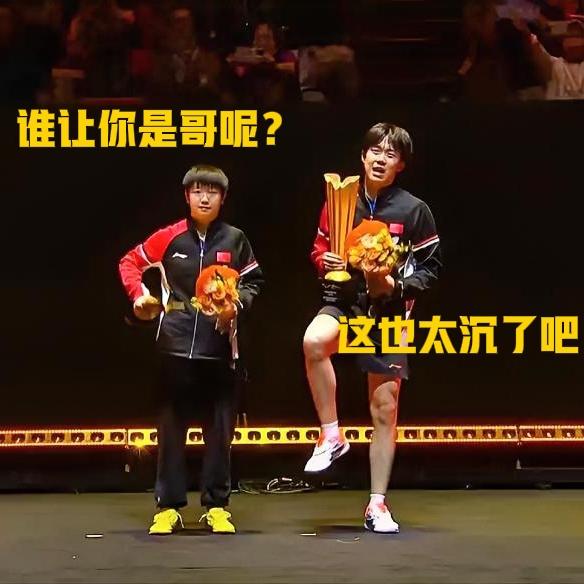 我宣布, 王楚钦孙颖莎最大的对手出现了, 不是黄友政陈熠,也不是雨果布鲁娜,而是冠军奖杯,你看这奖杯把王楚钦沉得,还得靠大腿支撑才能勉强举起。 据说这个奖杯重达22斤,难怪在领奖台的时候,王楚钦用大腿当支点,网友调侃这哪是奖杯,分明是块铁。莎莎小手都快拿不住啦,又不是真金的整那么沉干嘛,大头心疼莎莎,就没用莎莎拍照。 不过沉才证明分量足,这股不服沉的劲头,值得我们学习。莎头组合拿过的奖杯堆成山,哪次不是笑着扛?奖杯重,胜利更重!就像咱们过日子,苦累不算啥,扛过去就是甜!你说是不是? 奖杯沉不可怕,怕的是丢了扛起来的勇气!王楚钦、孙颖莎用行动告诉咱:遇到难处,咬咬牙,咱也能扛起生活的大奖杯!你说呢?
