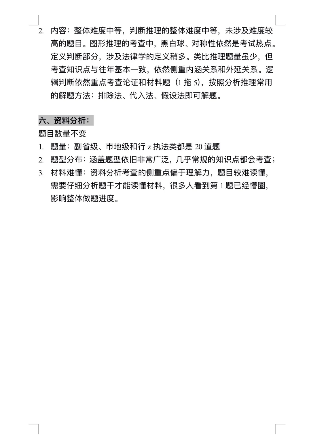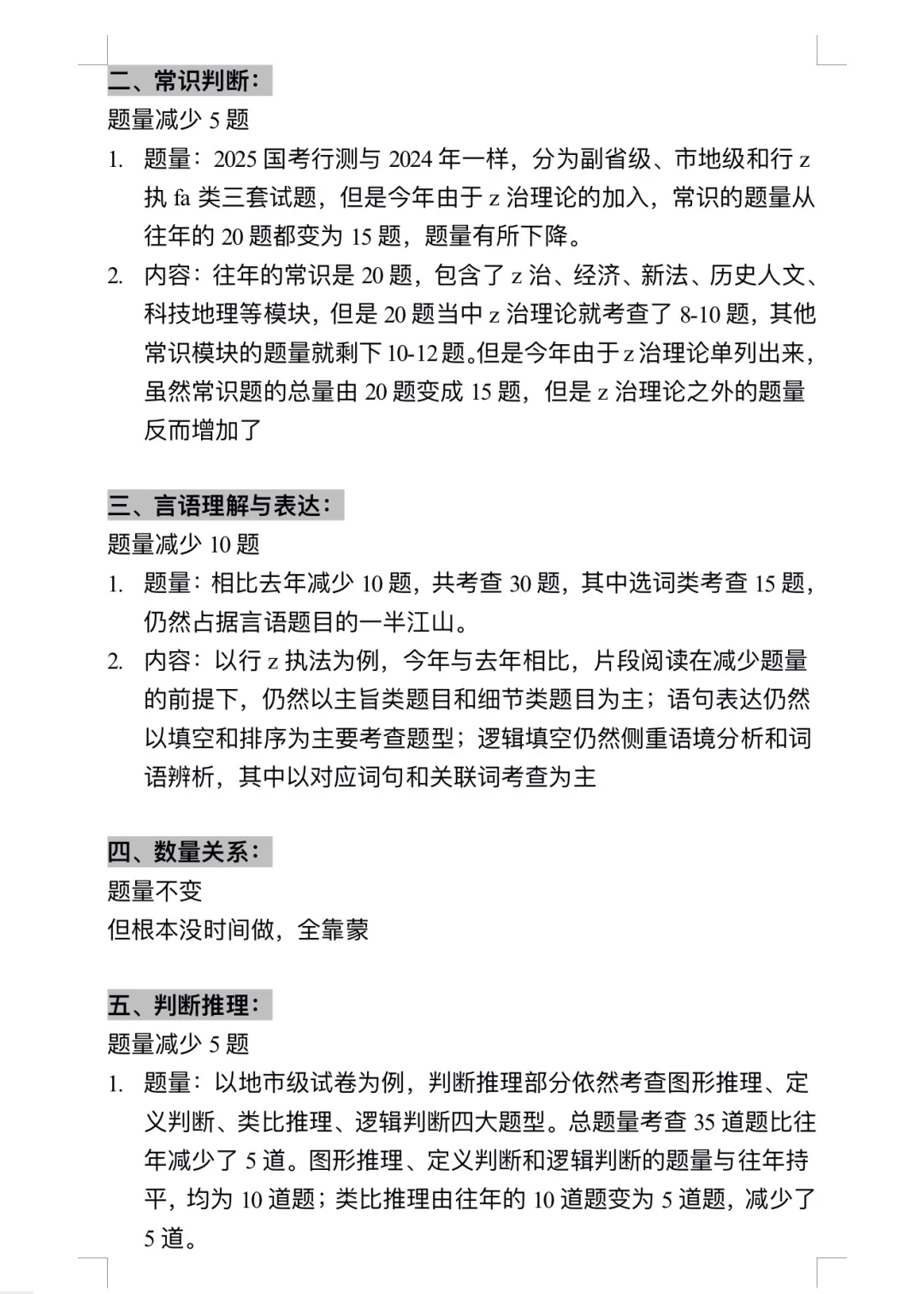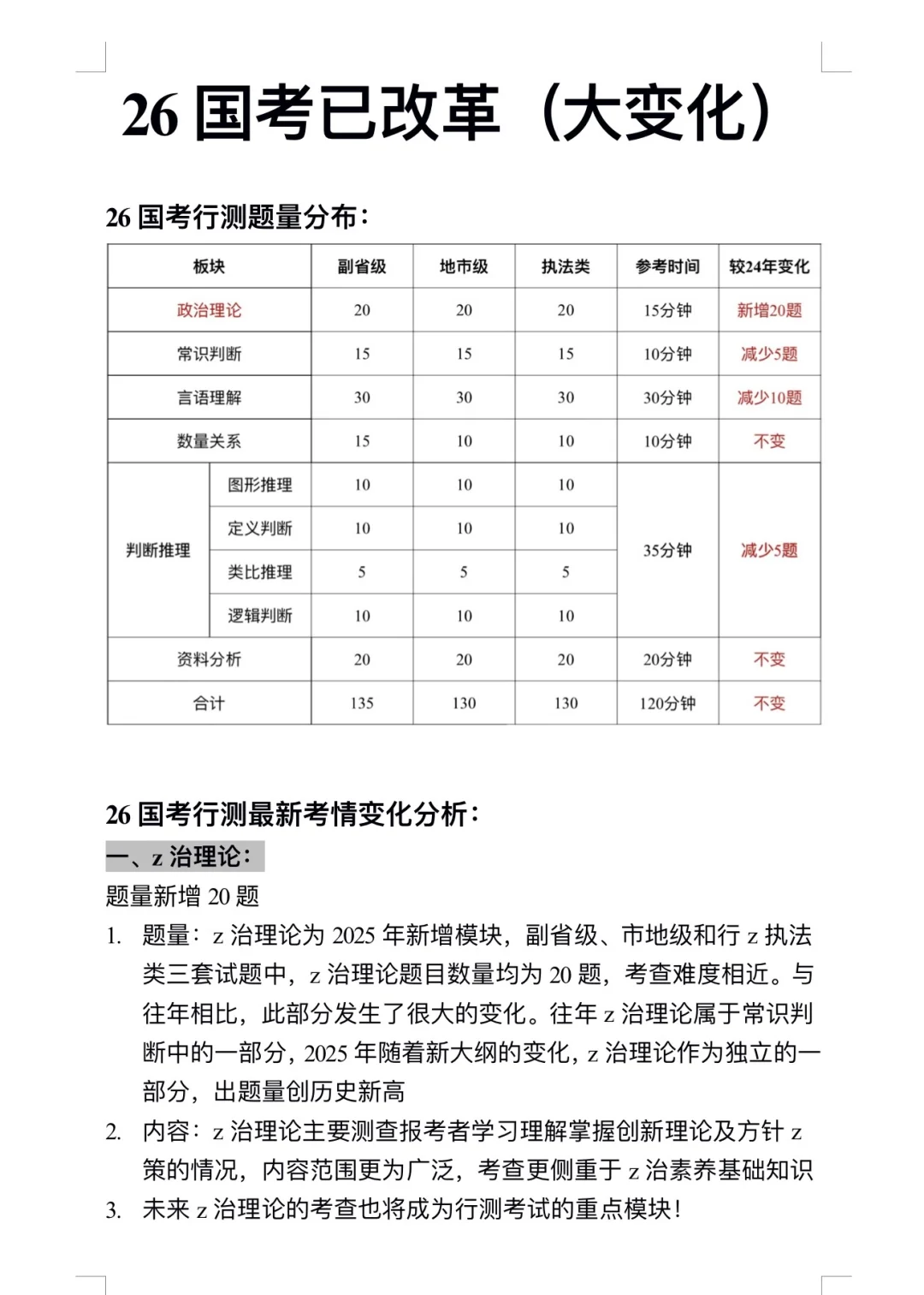 国考从去年开始考情就已经发生了重大变化,25国考行测新增“z治理论”模块,整体题型、题量发生了较大变化。 大家一定要认准最新考情再去备考,千万别学错了!! ✅26国考行测的主要变化包括 1️⃣z治理论:新增20题,副省级、地市级、zhi法类三套试题中均为20题。 2️⃣常识判断:题量从往年的20题减少到15题,其中z治理论占8-10题,其他常识模块减少。 3️⃣言语理解与表达:题量减少10题,共30题 4️⃣判断推理:总题量减少5道,差在类比推理减少5道。 5️⃣数量关系:题量不变,副省级试卷设置15题,其他试卷为10题。 6️⃣资料分析:题量不变,每套试卷20道题 - ✅行测和申论题型题量 1️⃣行测考试: ▶︎副省级题量:135道 ▶︎地市及执法岗题量:130道(副省级多出的5道题在数量关系上) ▶︎行测考试题型:分为z治理论、常识判断、言语理解与表达、数量关系、判断推理和资料分析等部分 - 2️⃣申论考试题量: ▶︎副省级、地市及zhi法岗均为5道题(4小题+1作文),每年作文的分值不变,其他4小题的题型和分值可能会有细小变化 ▶︎申论考试题型:按照zyjg及其s级直属机构综合管理类、市(地)级及以下直属机构综合管理类和行z执法类三类职位,分别命制试题 - ✅各模块分值分布(参考25年考情) 1️⃣zz理论:20题×0.5分=10分 2️⃣常识判断:15题×0.5分=7.5分 3️⃣言语理解:30题×0.8分=24分 4️⃣数量关系:副省级15题×1分=15分/地市级10题×1分=10分 5️⃣判断推理:35题总分约28分(图推/定义/类比每题0.8分,逻辑判断每题0.85分) 6️⃣资料分析:20题×1分=20分