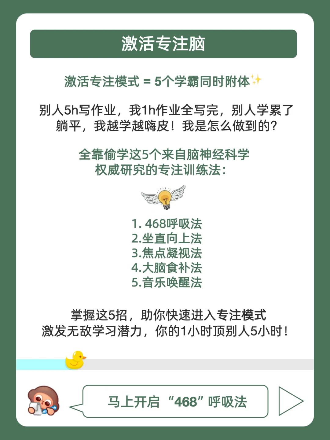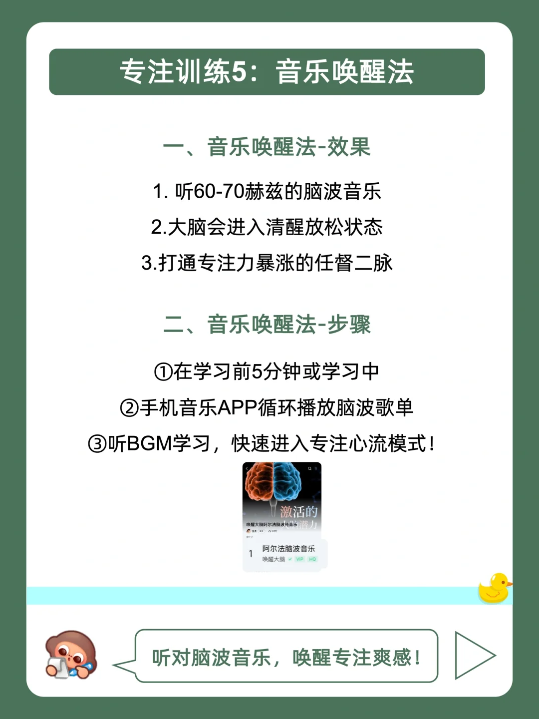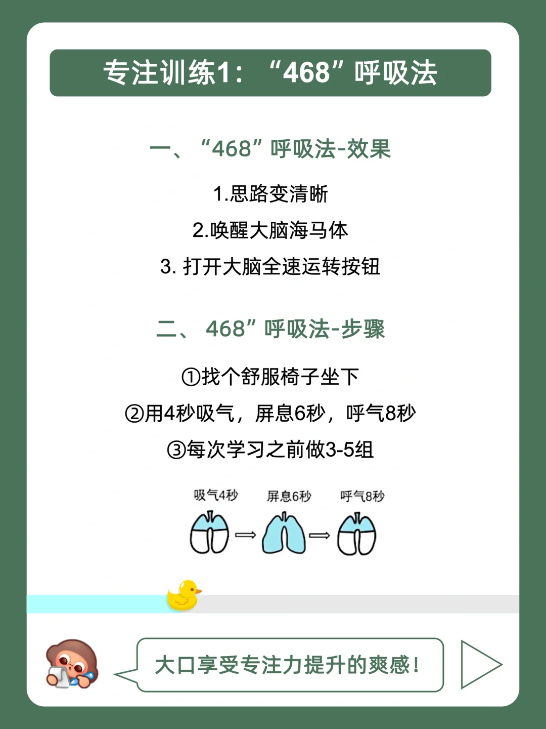 468呼吸法➕坐直向上法➕焦点凝视法➕大脑食补法➕音乐唤醒法