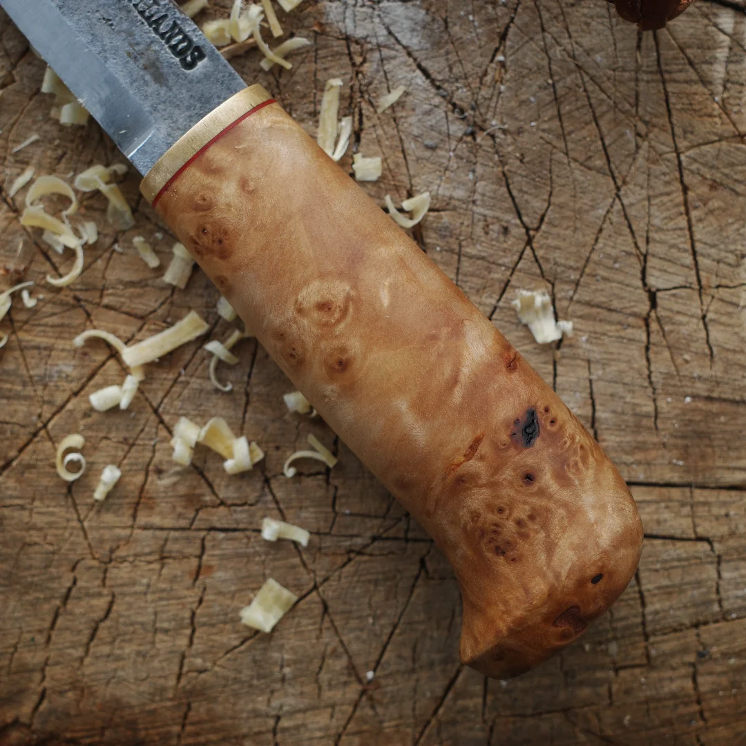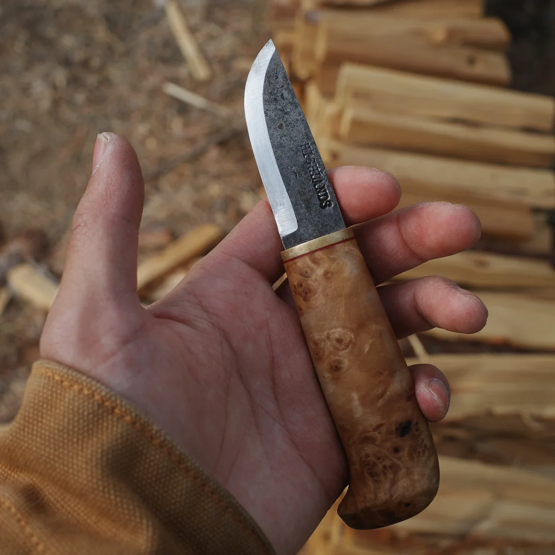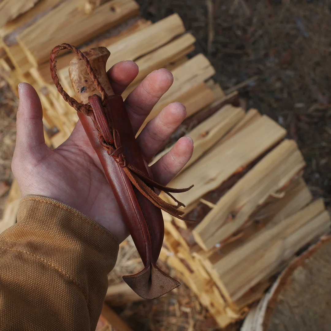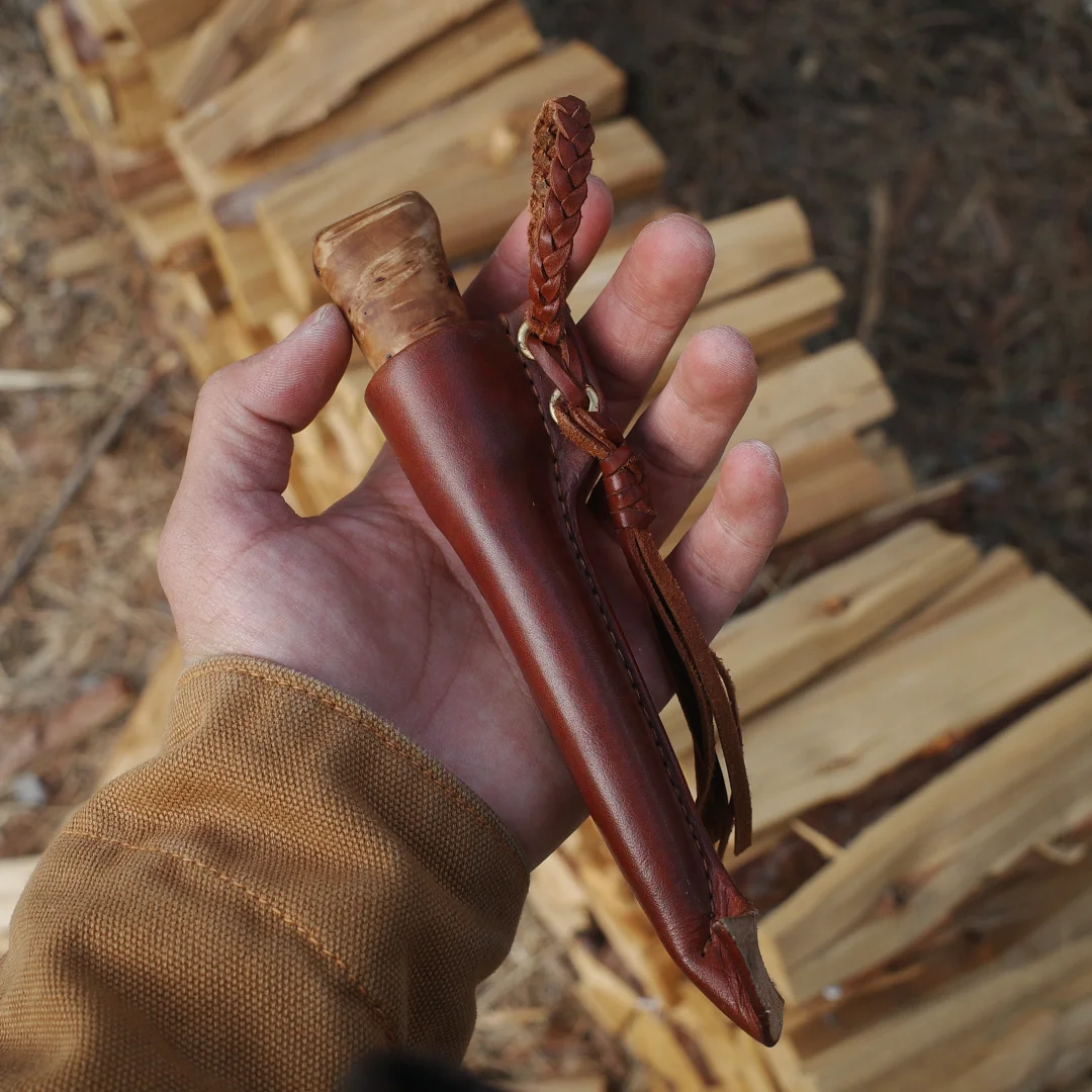 完美诠释了「短小精悍」 每一个物品都值得有名字 我给它取名“小丑” 52100钢材 桦木瘤手柄 牛皮鱼尾形刀鞘