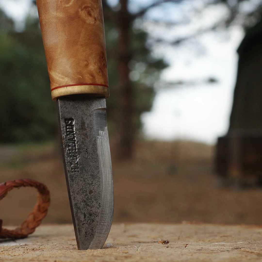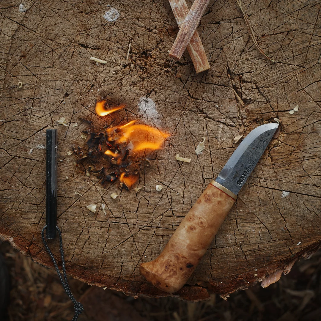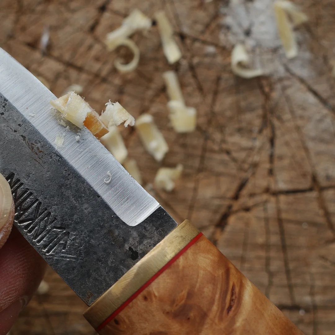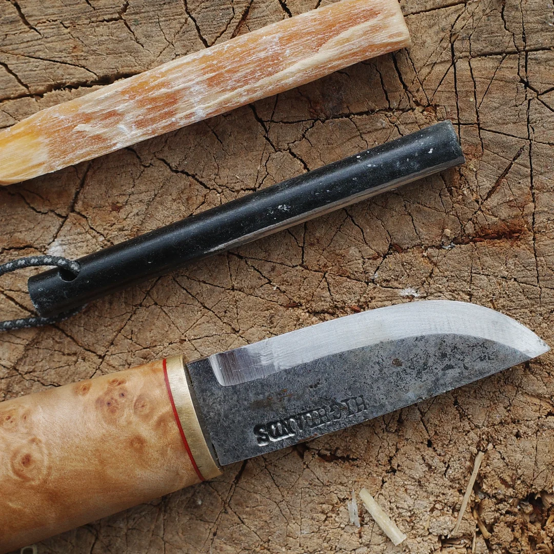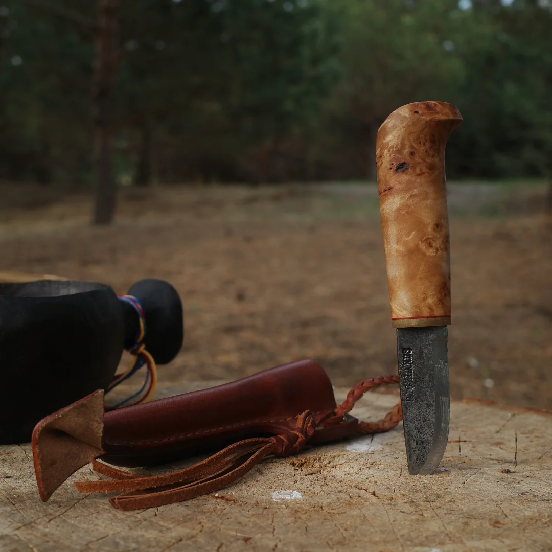 完美诠释了「短小精悍」 每一个物品都值得有名字 我给它取名“小丑” 52100钢材 桦木瘤手柄 牛皮鱼尾形刀鞘