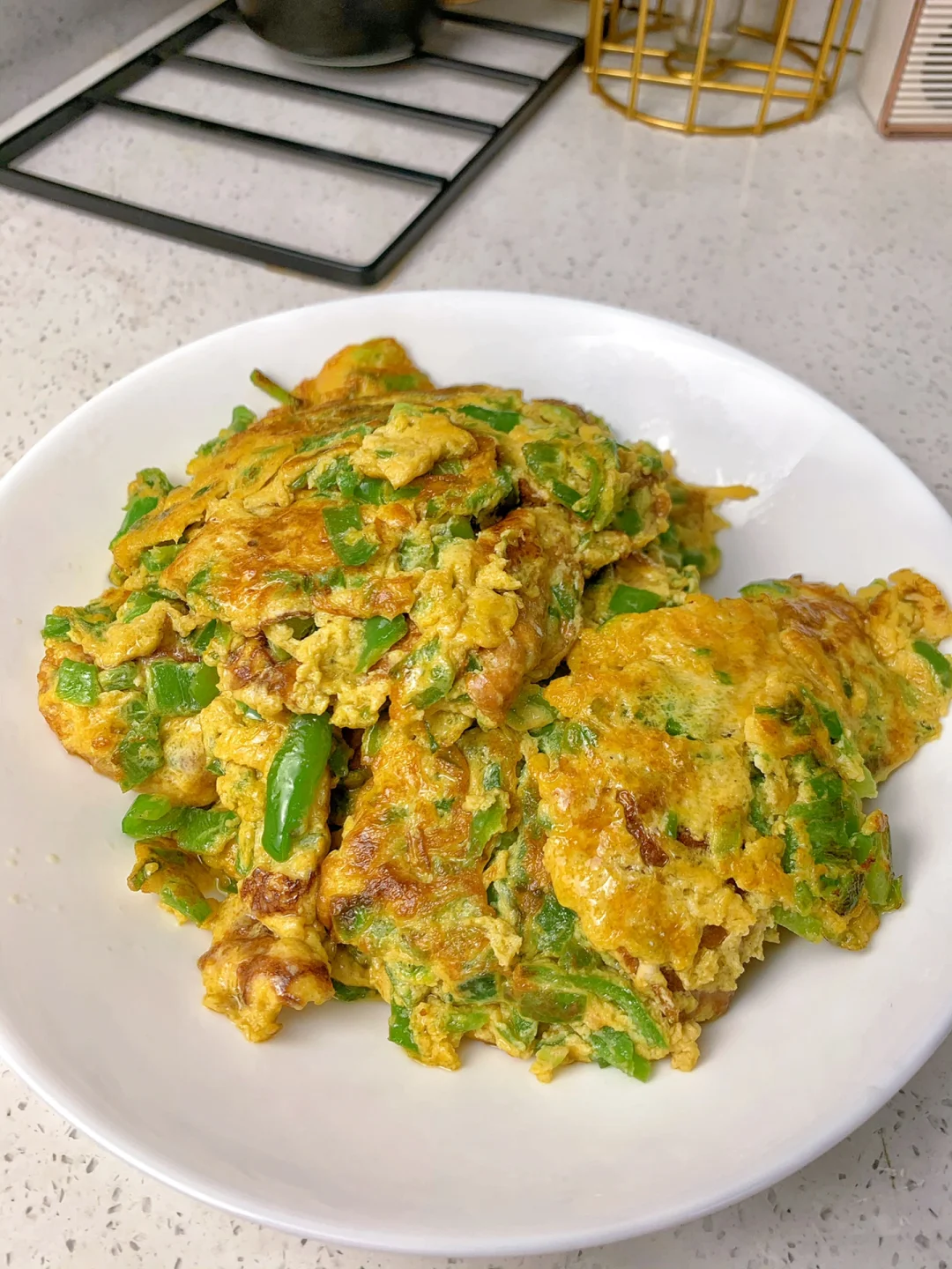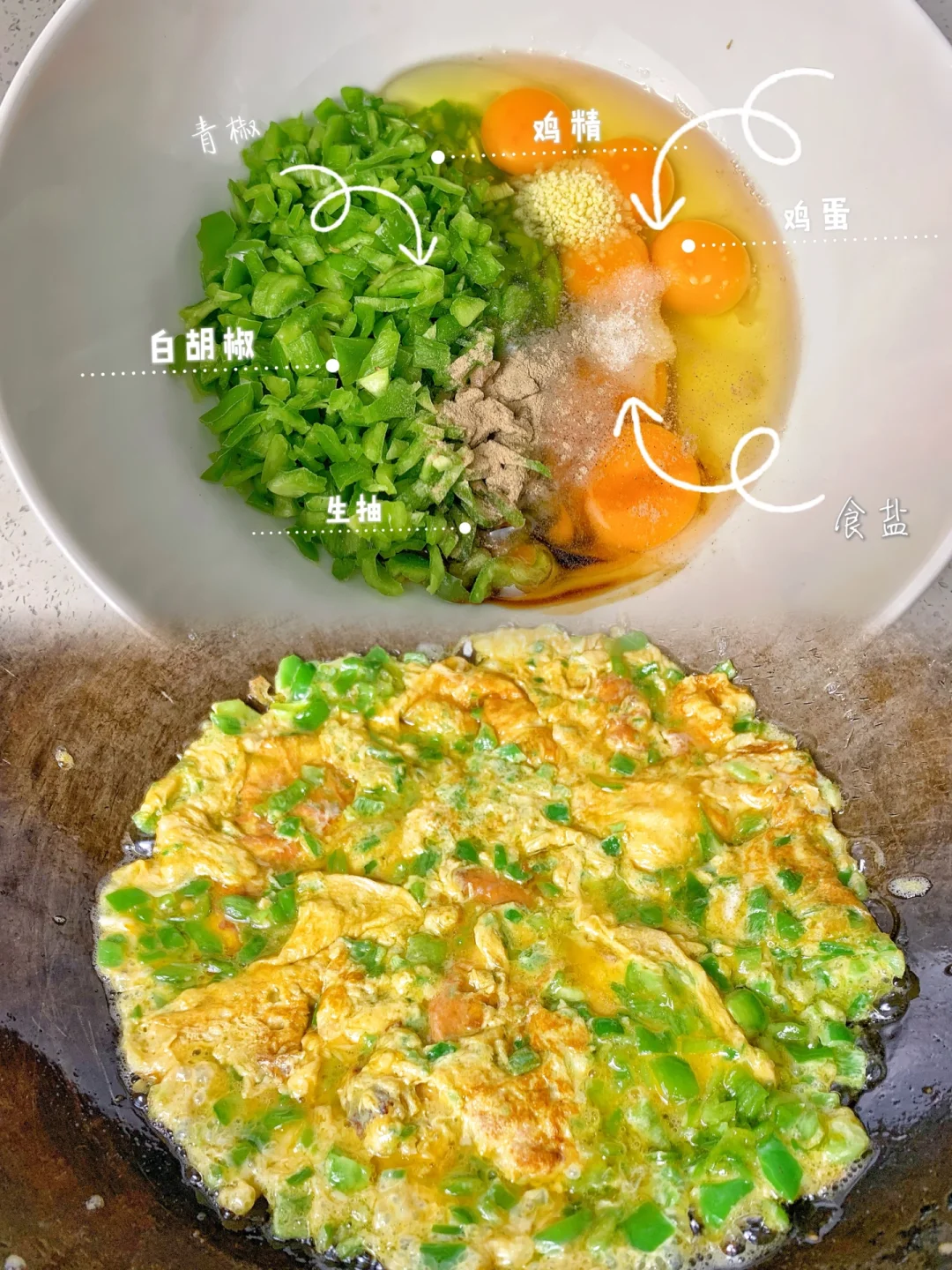 1⃣️青椒切丁,放入5~6个鸡蛋,少许食盐,白胡椒,鸡精,生抽打散,油温5成热,凝固后翻面,多次来回翻面,全程中小火就不会糊,喷香