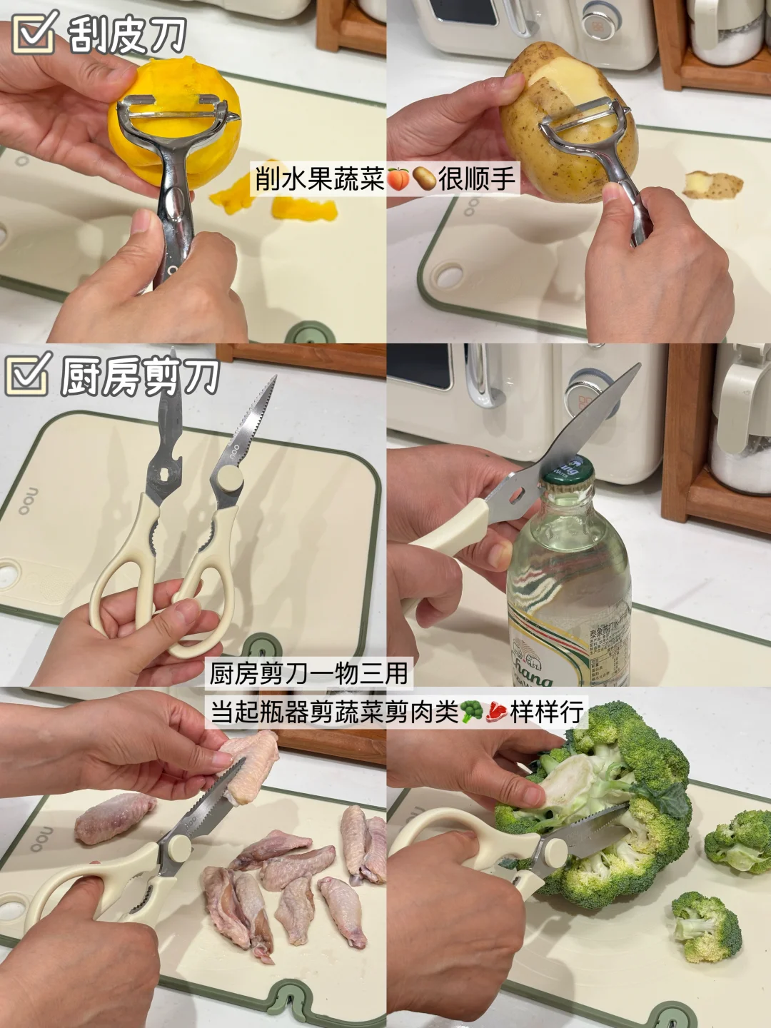 自带的厨房剪刀还能剪辣椒🌶️、开花刀🐟、剪鸡翅🍗、起瓶盖🫙,刮皮刀用来削水果蔬菜🥒🍑都很顺手,小户型真的很需要这种一物多用的工具!