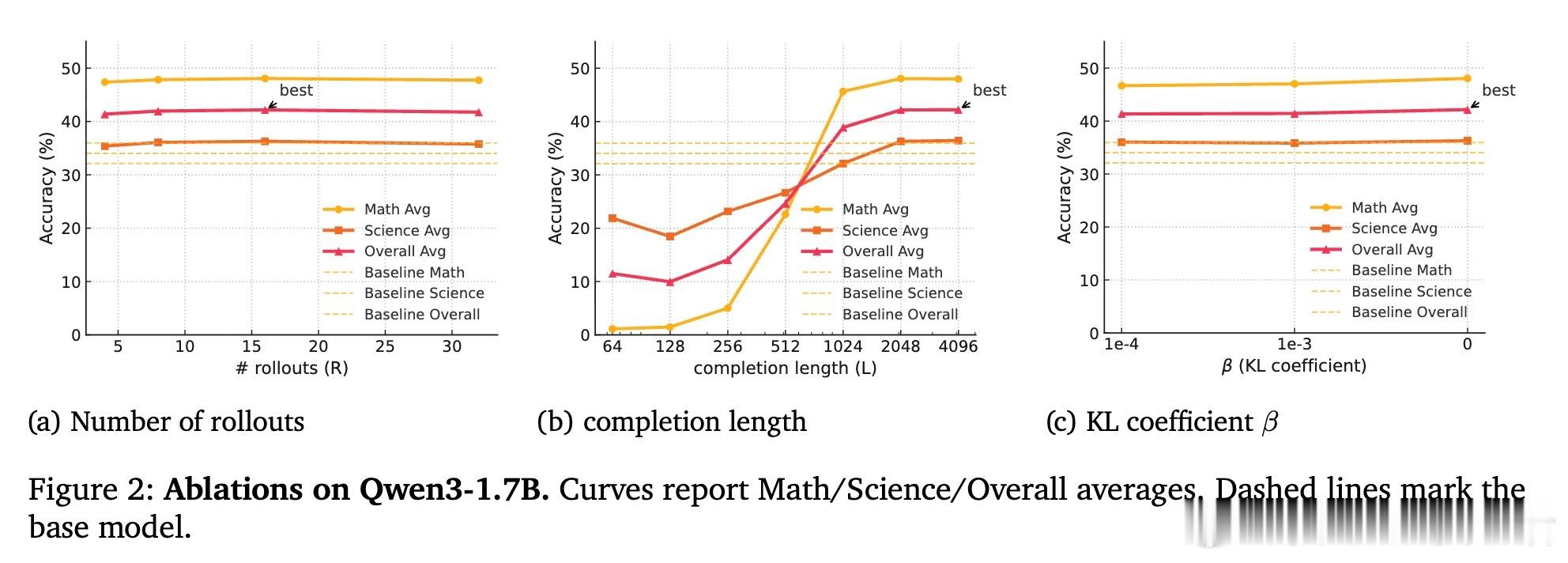 • 设计了稳定高效的训练算法,包括EMA(指数滑动平均)教师模型作为动态无思考基线、多思路采样的组内相对优势估计和裁剪重要性比率,保证算法稳定收敛。