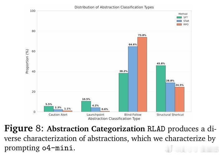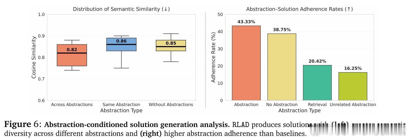 • 双模型强化学习训练框架RLAD:一方生成多样抽象,另一方基于抽象条件生成解答,奖励机制鼓励抽象提升解答准确率,实现结构化探索与信号解耦。