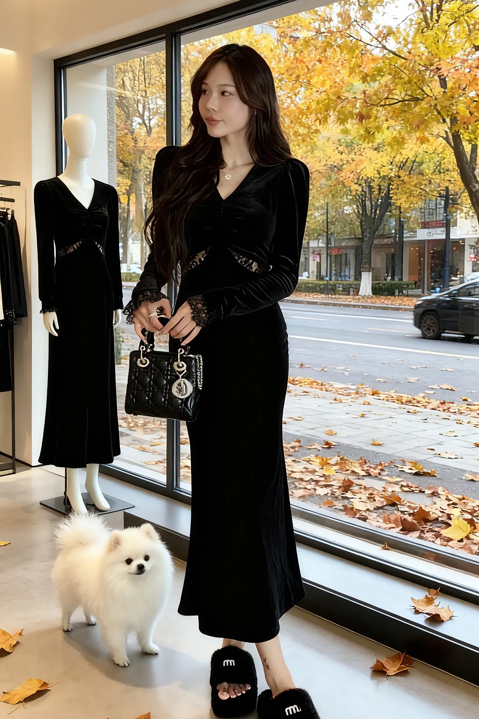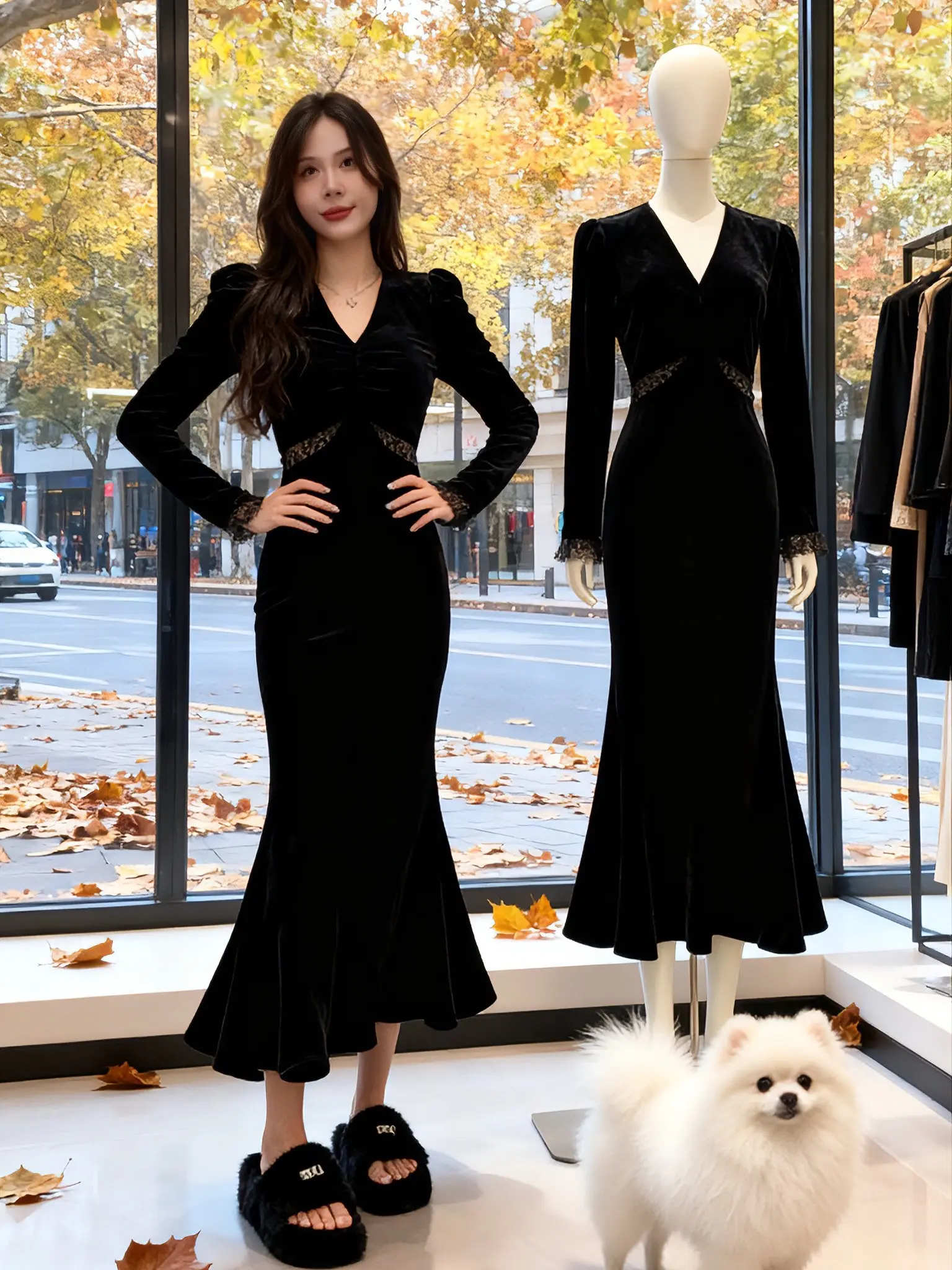 在秋日氛围感的服装店里,和同款穿搭的人体模型同框,连博美犬都被这条裙子的魅力征服~