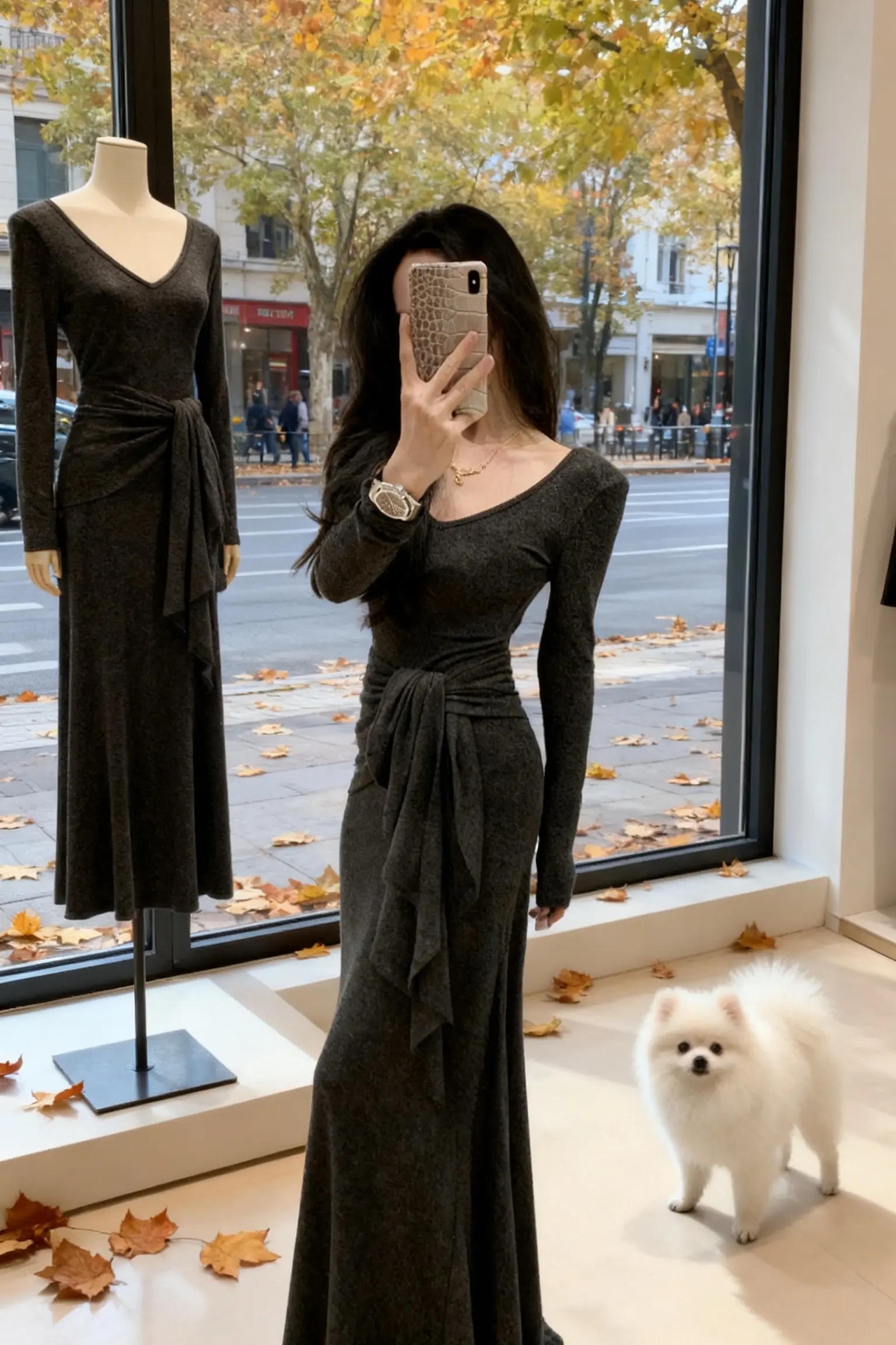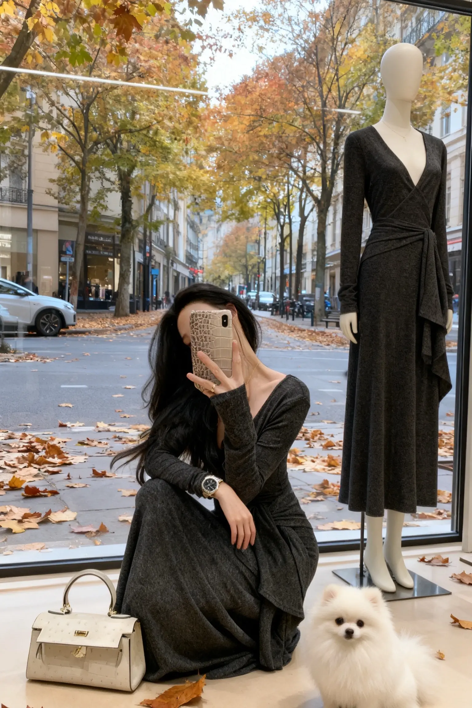 在秋日氛围感拉满的服装店内,和同款穿搭的人体模型同框,连博美犬都被这份优雅吸引。不管是日常通勤还是约会逛街,这条裙子都能让你优雅出圈~