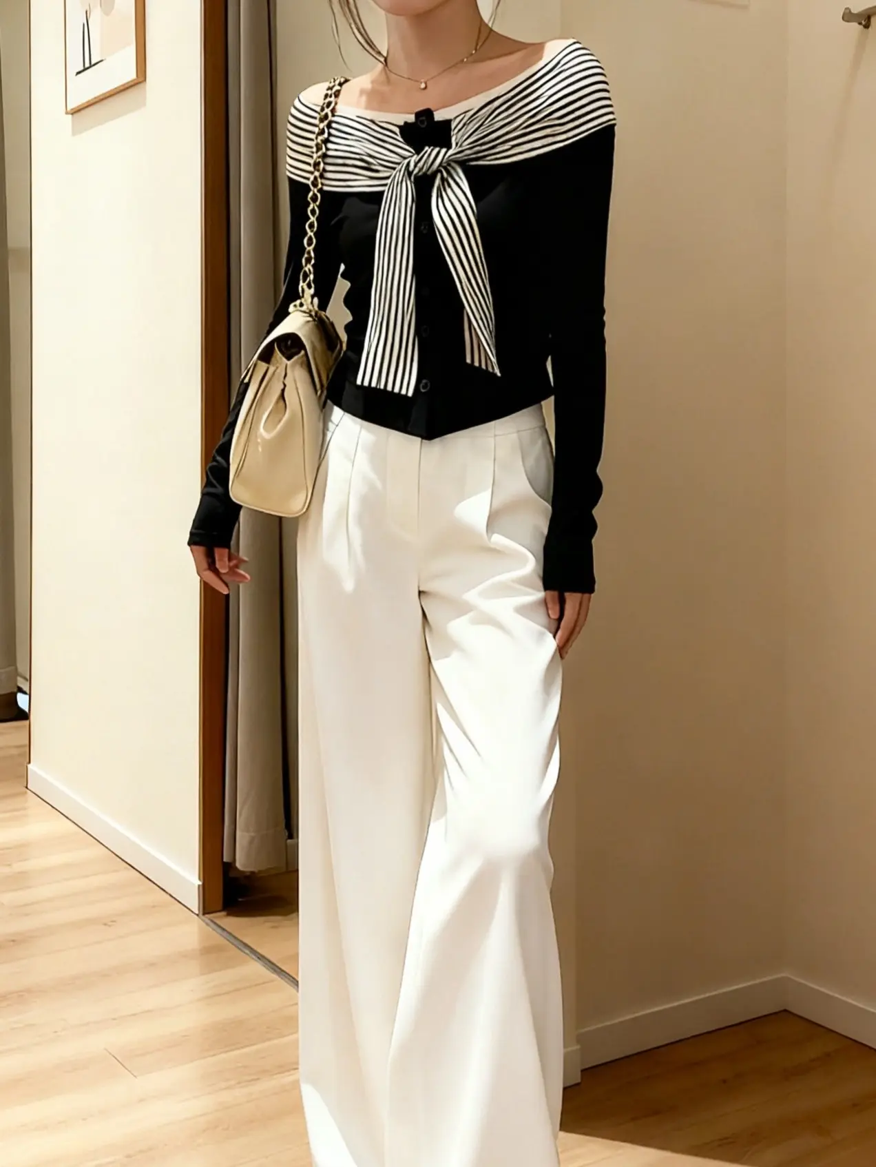 “法式氛围感拉满!黑白条纹蝴蝶结上衣精致又显锁骨,搭配垂感十足的白色阔...