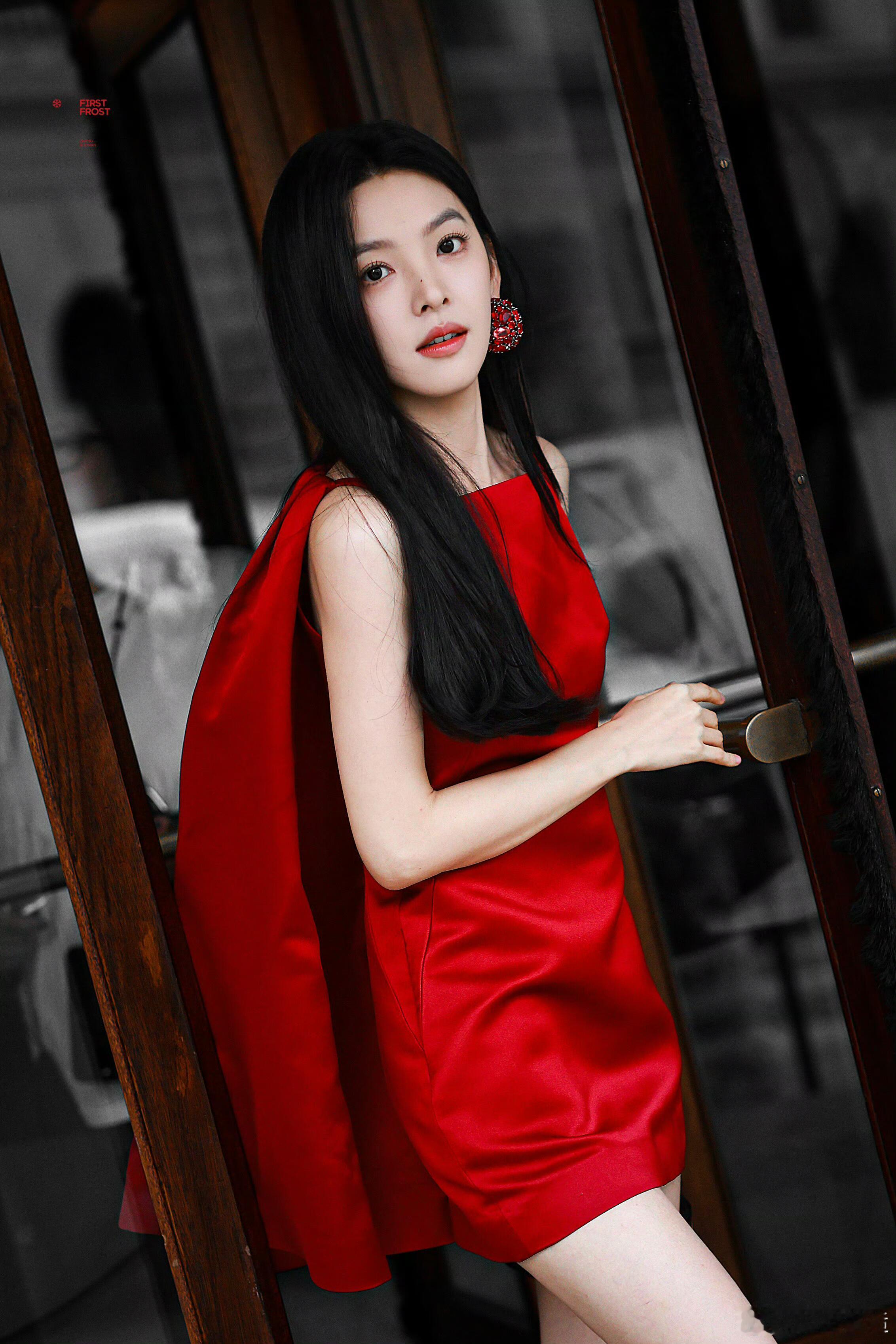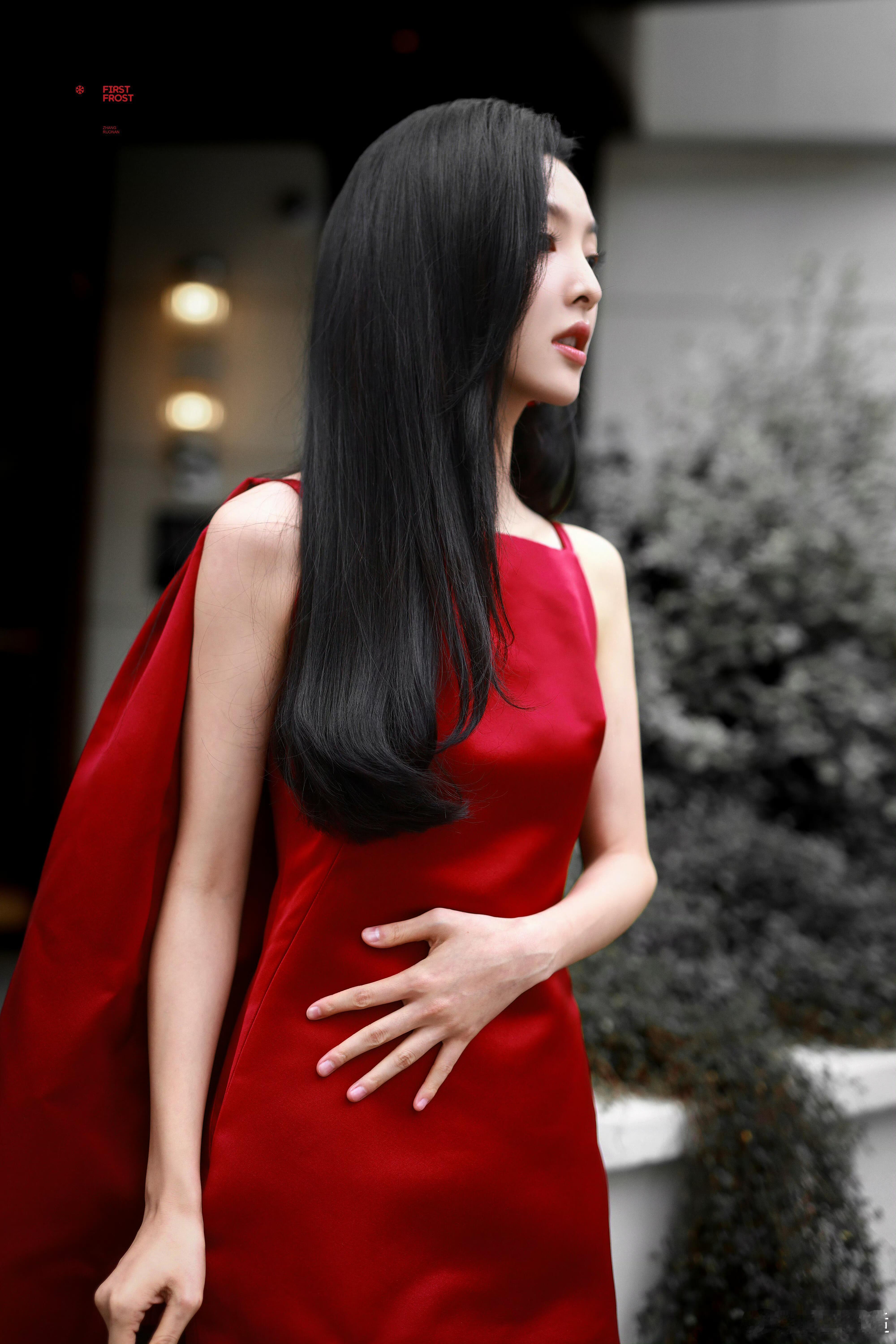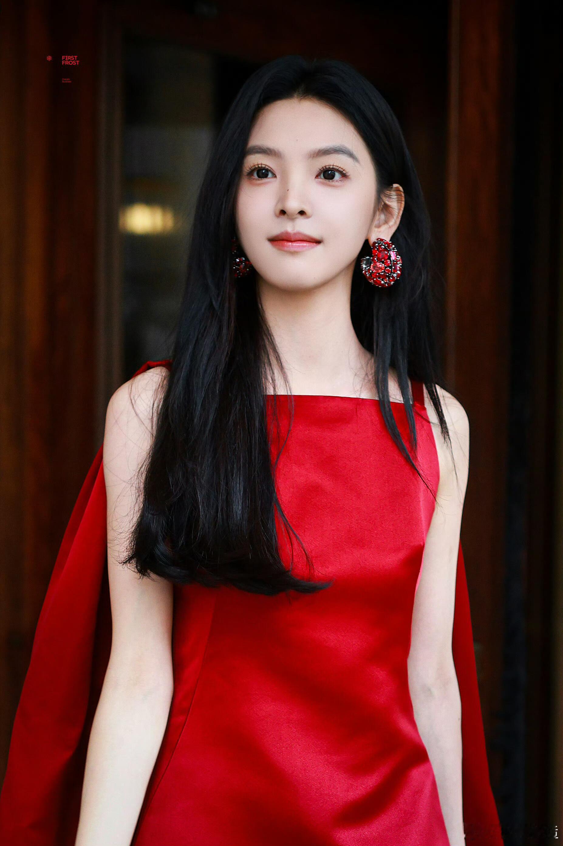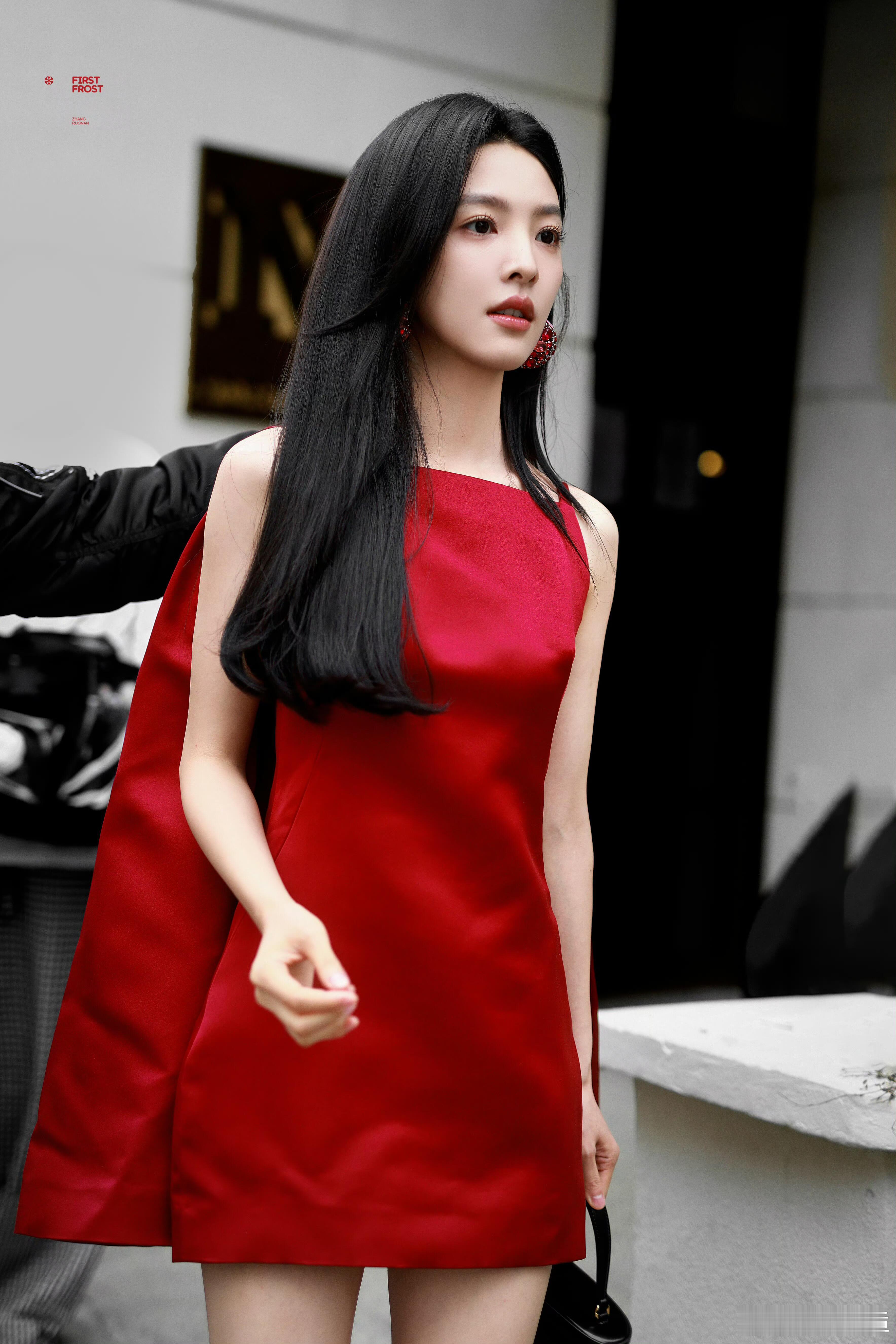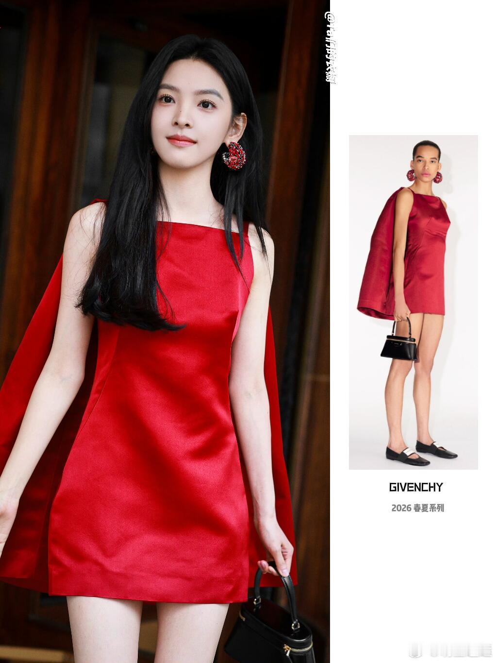 章若楠时装周看秀造型,一袭Givenchy 2026春夏系列红裙,缎面材质在光影中流淌着高级光泽,不对称单肩斗篷设计自带气场,搭配同系列红色宝石耳环,与乌黑长发形成鲜明撞色,利落方领勾勒锁骨线条,短裙摆秀出纤细长腿。少女感与摩登范儿完美融合,期待她在秀场绽放更多光彩