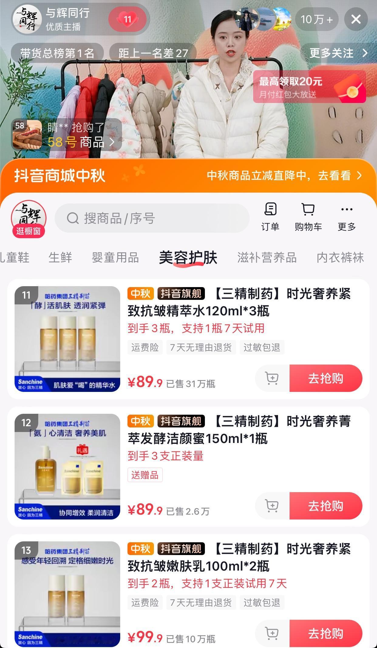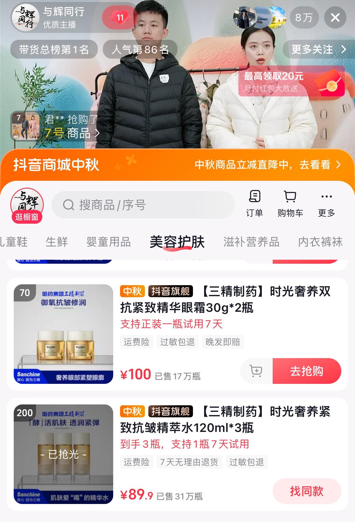 今天与辉同行开播 在线人数很快冲到11万人 小贝作为第一个回来拉磨的主播 获得了观众们的热情问候 看得出来大家甚是想念 小贝的吉祥话说了很多 听着确实心情愉悦[耶] 她说她这几天没有离开北京 上班到6日上午然后回家过节 并开始她的错峰长假之旅 小贝这个休假时间美 最拥挤的时候过去了 想去哪儿玩人都不会太多 今天小黄车里上了三精的产品 精粹水又被一抢而空 4万多单产品说没就没 现在是10月4日8点15分 直播间里依然还有8万多人 与辉同行消费者确实厉害 尤其这购买力不服不行[赞]