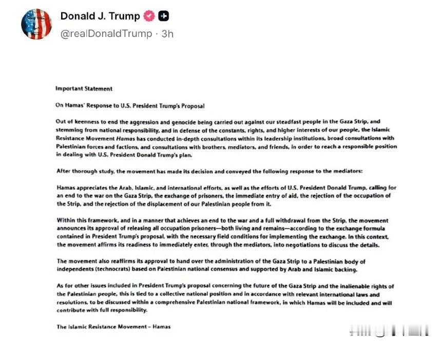 特朗普转发了哈马斯对“和平协议”的回应。 -------------------- 关于哈马斯对美国总统特朗普提议的回应 出于结束对加沙地带坚定人民的侵略与种族灭绝的迫切愿望,并基于国家责任,以及为了捍卫我人民的基本立场、权利和最高利益,伊斯兰抵抗运动(哈马斯)在其领导机构内进行了深入磋商,并与巴勒斯坦力量和派别进行了广泛磋商,同时也与兄弟、调解人和朋友们进行了讨论,以便就如何处理美国总统唐纳德·特朗普的计划形成一个负责任的立场。 经过深入研究,该运动已作出决定,并向调解人传达如下回应: 哈马斯赞赏阿拉伯、伊斯兰以及国际社会的努力,同时也赞赏美国总统唐纳德·特朗普为结束加沙地带战争、推动囚犯交换、立即允许援助进入、拒绝对加沙的占领,以及拒绝驱逐我们的巴勒斯坦人民所作的努力。 在这一框架下,并以实现战争的结束和全面撤出加沙地带为目标,该运动宣布同意释放所有占领当局囚犯,包括在世者和遗体。根据特朗普总统提议中的交换公式,并在具备必要的现场条件时执行交换。在这一背景下,该运动确认其准备立即通过调解人进入谈判,以讨论具体细节。 该运动还重申其同意将加沙地带的管理权移交给一个基于巴勒斯坦全国共识、并获得阿拉伯和伊斯兰支持的巴勒斯坦独立(技术官僚)机构。 至于特朗普总统提议中涉及加沙地带未来以及巴勒斯坦人民不可剥夺权利的其他问题,这与集体的民族立场相连,并须依照相关国际法律和决议,在一个全面的巴勒斯坦民族框架内进行讨论,哈马斯将在其中参与并承担全部责任。 伊斯兰抵抗运动 – 哈马斯