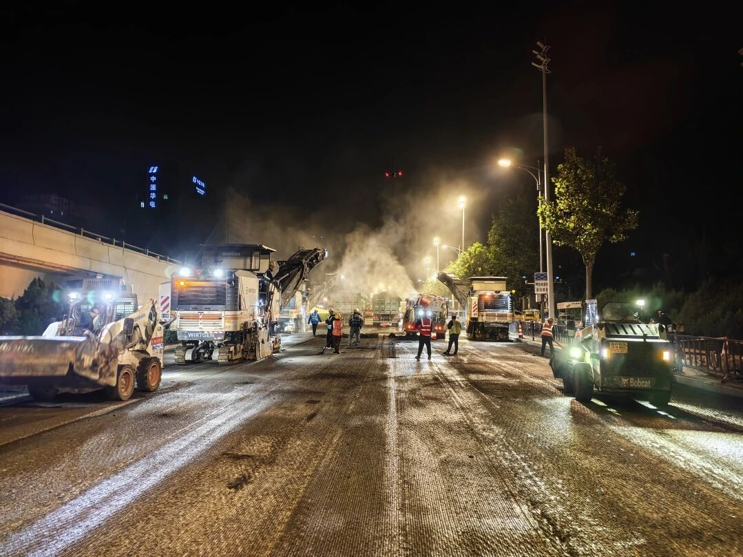 目前,城建集团公司建设团队累计完成铣刨罩面12.71万平方米,累计摊铺5085立方米,完成基层注浆施工5703平方米,266座检查井和196处雨水箅施工已全部完成;金曰集团公司建设团队已累计完成铣刨罩面69961平方米,就地热再生施工累计完成62133平方米,含砂雾封层累计完成18300平方米,注浆累计完成16845平方米,190座检查井和147处雨水箅施工已全部完成;金宇集团公司建设团队已累计完成双组份标线施划12386平方米,拆除原有中央护栏累计完成4779米,中央护栏安装累计完成4076米。
