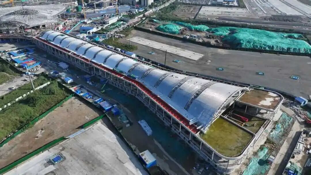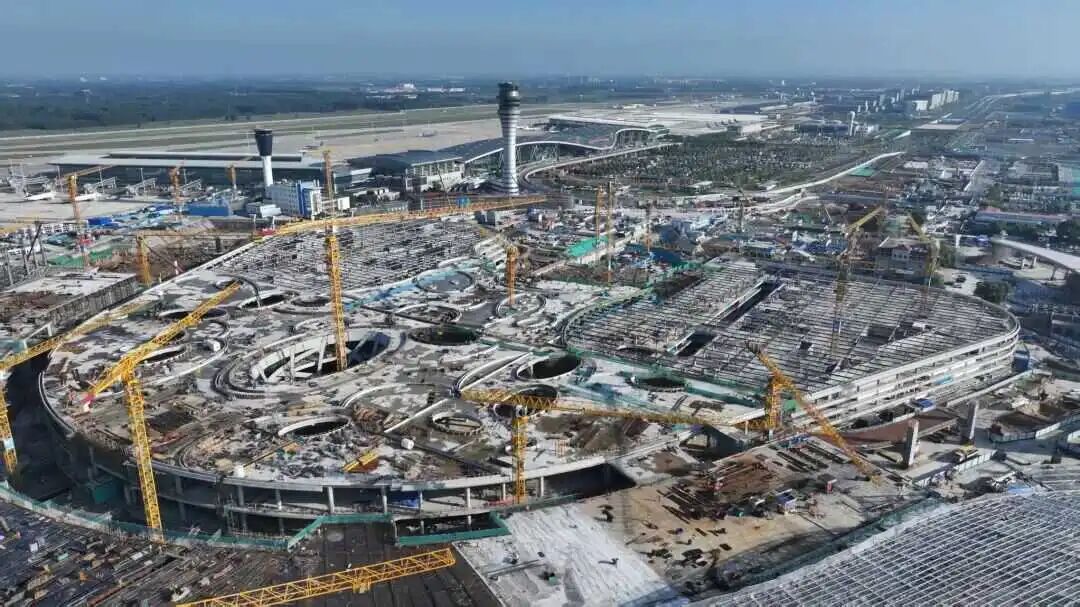 项目团队持续优化施工组织,统筹推进建设进度,狠抓施工安全质量,全时全域饱和施工,全力冲刺关键进度节点和年度任务目标。截至目前,T2航站楼主楼混凝土结构基本完成封顶,首开区提升1区钢结构屋盖完成提升;D、E指廊完成合拢;新塔台完成建设;综合交通中心主体结构封顶;西飞行区展开跑道道面施工,同步推进安装工程施工。
