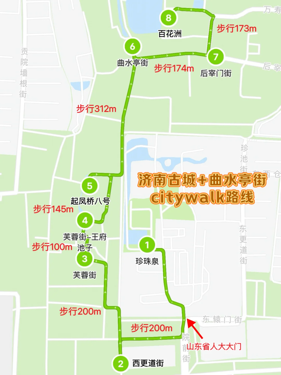 假期来济南一定不要错过曲水亭街‼️ 一边是青砖灰瓦的古城 一边是碧波荡漾的清泉 小桥流水人家在此刻具象化了 教你不走回头路2h拍照打卡攻略 - 📍【先说路线】 珍珠泉➠西更道街➠芙蓉街➠王府池子➠起凤桥八号➠曲水亭街➠后宰门街➠百花洲➠大明湖➠超然楼 - 🚩【详细说说】 1️⃣珍珠泉:在山东省人大里面 因不敢进差点错过的济南世外桃源 无需预约🆓进门左手边往里走 锦鲤很多 小众泉眼 · 2️⃣西更道街:从人大出来右拐 走一走济南古城里的老街道 · 3️⃣芙蓉街:小吃街 尝尝济南特色油旋 芙蓉泉烤鸡爪 也可晚上再来逛 · 4️⃣王府池子:隐藏在老城区的宝藏泉水濯缨泉 一池碧水 清澈见底 大胖锦鲤 人少好拍 · 5️⃣起凤桥八号:直接导航即可 打卡网红机位 仿佛到了江南 拍照好看 节假日人较多 · 6️⃣曲水亭街:泉水两侧有很多好拍的店和茶馆 买个酸蘸儿 打卡涌泉胡同和济南大字 · 7️⃣后宰门街:小众老街不容错过 打卡红墙济南大字 横版济南府 · 8️⃣百花洲:导航阡陌书店 打卡济南大字 旁边还有两个大字墙可拍 - 从百花洲出去就是大明湖 看看大明湖畔的夏雨荷 再往前走就是超然楼 19点15看亮灯相当壮观👍