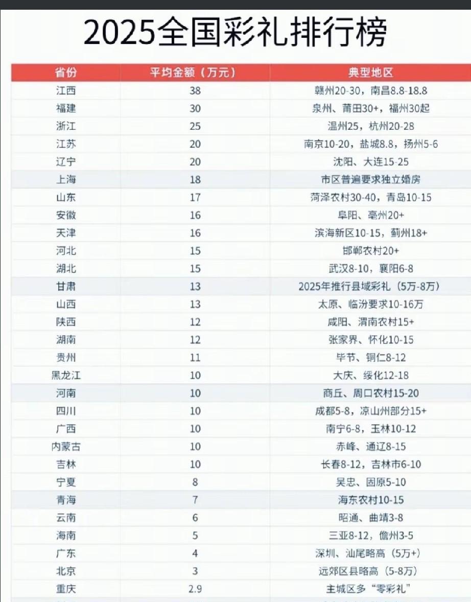 江西,福建,浙江拿下全国彩礼排行榜前三名,男孩子结婚压力最大的3个省 国庆期间,一张全国彩礼排行榜引发网络热议,可以肯定一点,这个排行榜绝对不是官方发的,因为官方不可能,也不会做这种榜单出来。 但是这个排行榜民间认同度还挺高的,看来与平时老百姓的感官一致,江西省以均价38万元拿下全国第一,福建省以30万元排名第二,浙江省25万元排名第三,可见江西,福建,浙江3省娶老婆的压力最大。 其中三省的赣州,南昌,泉州,莆田,福州,温州,杭州等市最高。 彩礼这个事情,自古以来就有,也不能算陋习,只是民间习俗,但是近年来,因为彩礼问题引发的民间矛盾越来越多,争议越来越大,也没有什么特别好的解决办法,只能靠当地风俗,还有男女双方家庭协商解决了。#江西天价彩礼# #江西赣北彩礼# #江江西彩礼# #彩礼风云榜# #浙江婚嫁彩礼#