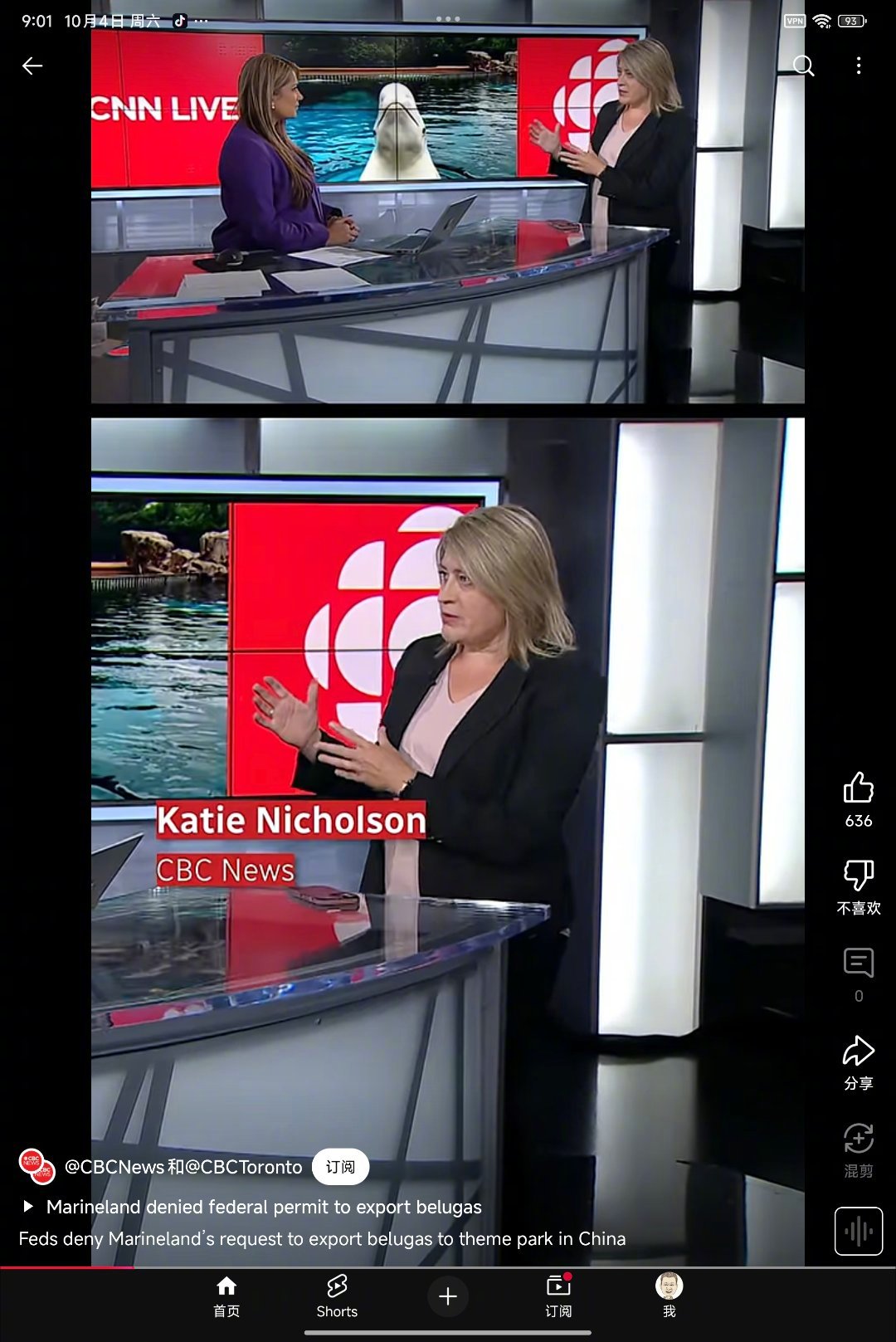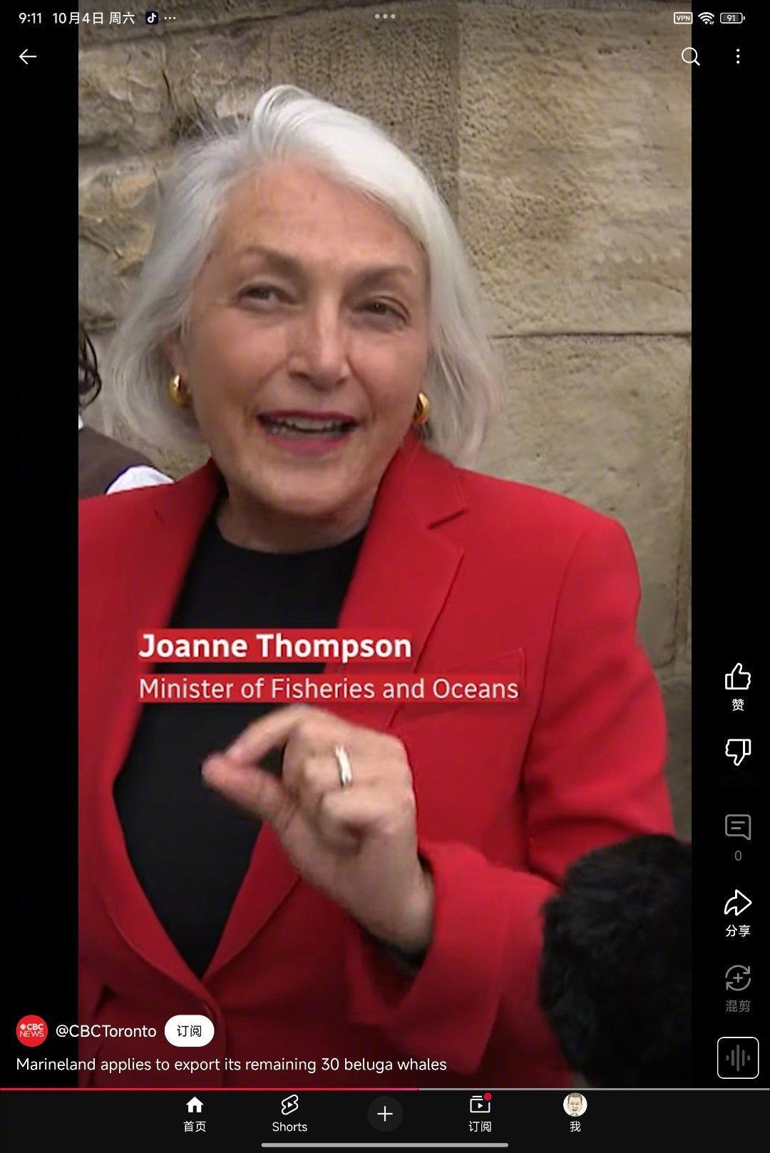 图8中CBC黑衣女记者讲述,海洋渔业部长(图9红衣)亲口给她说过,上个月实地考察,海洋渔业部长看着白鲸的眼睛,做出了禁止出口中国的决定。