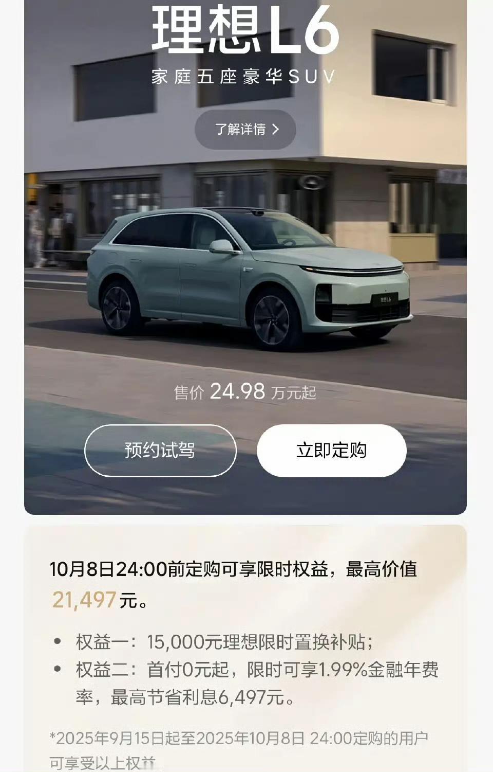 理想L系列限时补贴 1.5万 进入四季度,各品牌都在冲量了,“发明”周报的理想当前的状态,的确与去年有些差距,竞品也的确强悍。 降价促销!随着国补的预计退出,四季度是可以冲一冲量的。【来自懂车帝车友圈】