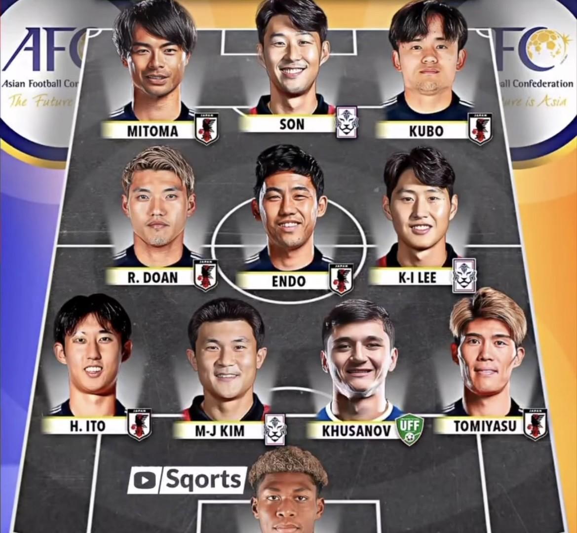 亚洲足坛目前的最强一阵! 前场三叉戟三笘薰、孙兴慜、久保建英,中场堂安律、远藤航、李刚仁,后卫线伊藤洋辉、金玟哉、胡桑诺夫、富安健洋,门将位置是铃木彩艳。11人除了年轻的胡桑诺夫来自乌兹别克斯坦,前中后孙兴慜、李刚仁、金玟哉三人来自韩国,剩下7人全部是日本球员。比较遗憾的是健康的黄喜灿其实可以占据中锋位置,孙兴慜打左边锋,替掉三球王,无敌阵容!