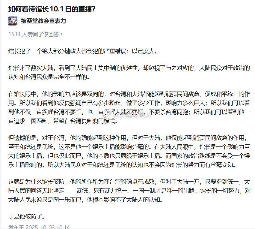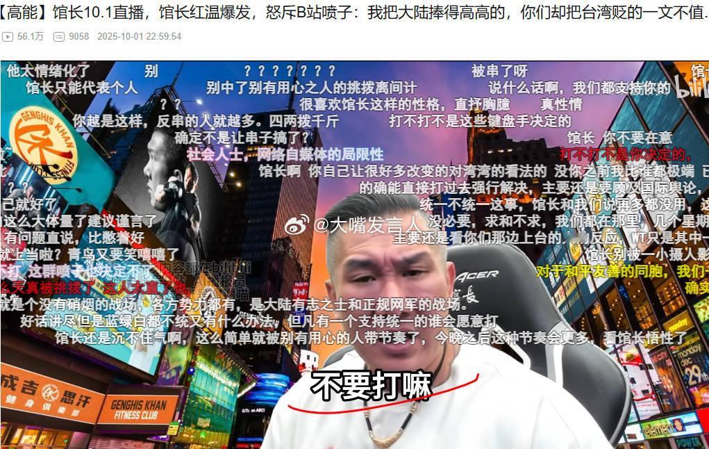 他认为他对大陆表达了足够的友好,大陆一些网民就不能提武统了,喜欢给他打赏的人可以问问他,你不让大陆武统、你准备怎么处置抬独的民劲档,你怎么评论柯自称深绿、黄国昌原来是绿营战将,你为什么交好柯黄?[馋嘴][馋嘴]
