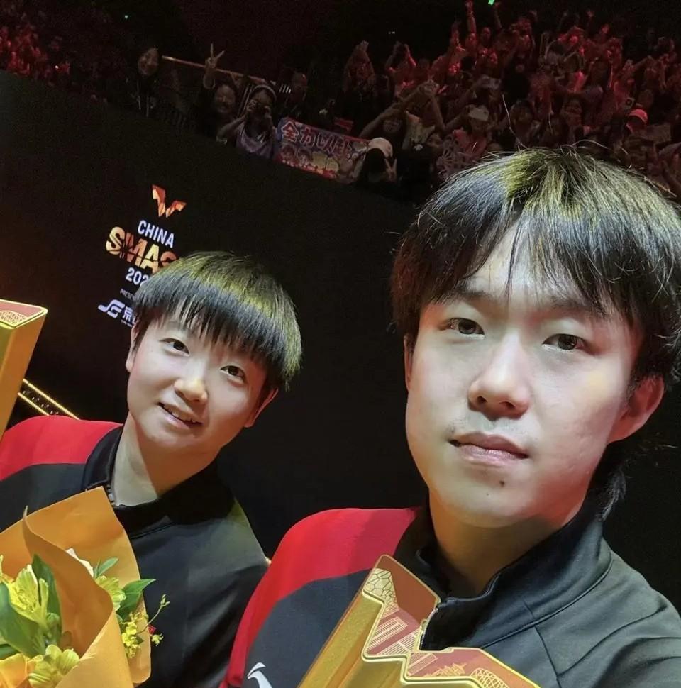 WTT中国大满贯赛混双决赛,世乒赛夺冠后四个月再次“合体”的王楚钦/孙颖莎一路杀入决赛,对阵年轻队友黄友政/陈熠,首局11:8拿下后,第二局一度以9:2领先,但被黄友政/陈熠追至9:10,“莎头组合”请求暂停后连得两分,以11:9拿下,第三局双方同样陷入激战,最终王楚钦/孙颖莎以11:9获胜,获得冠军。颁奖仪式上,三个人穿短裤,只有莎莎一人穿长裤,咱不比腿长,就比成绩。