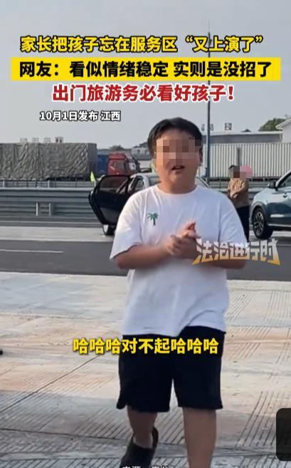 “离了个大谱!”10月1日,江西,一男孩被粗心家长遗忘在了服务区,家长意识到后火速开车回去接,男孩情绪特别稳定,一边拍手一边平静吐槽着,网友:小孩哥看似情绪稳定,实则是没招了! 家长将自己孩子落在服务区的事情可太常见了,可还是有些“马大哈”不从中总结经验教训,在服务区休整完,不检查出行人员全不全就将车开走。 一男孩十一假期和家长出门旅游,途中经过一个服务区时一家人下车休息,谁知,休息完后粗心的家长直接开车上路,被留在服务区的男孩只能眼睁睁看爸妈把车开走。 车已经开出去一段时间了,家长突然意识到自家儿子没上车,被落在了服务区,吓得赶紧将车开回去找孩子。 此时,男孩正在路边等待,焦急地看着远处的车辆,等待爸妈能想起来他们还有个孩子落在服务区,不一会儿,粗心的家长赶回了服务区,找到了自己的儿子。 男孩看到爸妈来后,没有哭闹,反而还十分淡定,他一脸无语,一边拍手鼓掌一边“称赞”自己爸妈的行为,家长看到这一幕笑得合不拢嘴,不断给儿子道歉。 不少网友觉得男孩淡定是因为确实没招了,家长带孩子出远门时一定要看好,不要存心将自家孩子落在服务区,一旦发生意外,后悔都来不及! 信息来源:《家长把孩子忘在服务区“又上演了” 网友:看似情绪稳定 实则是没招了 出门旅游务必看好孩子!》法治进行时