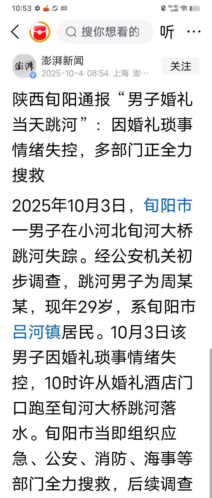 10月3号上午10点左右,陕西旬阳 吕河镇29岁的新郎官周某,因为婚礼琐事,从正在准备婚礼的旬阳某酒店跑到旬河大桥跳入河中,因近日下雨导致河水浑浊,现场人员看到周某在河水里露了一下头就被河水冲走,到目前仍然没有找到。 有网友心疼新郎,这是何必呢?婚结不了就不结,退了酒席退了彩礼从头再来, 不行单身也不错。 虽然网友说的很对,但是像周某这种情况都是在情绪崩溃的情况下失控行为,崩溃到整个理智系统坍塌了,就想马上解脱。 这就像唐僧取经,九九八十一难好不容易都过了,正要取得真经,又出来一个妖怪[捂脸]不是不想打,孙悟空实在是精疲力尽,超过它的耐受力了 ,看见妖怪直接晕倒了。 一些地方的婚姻陋习对男方家庭的压榨已经到了让人实在承受不起的地步,当地政府真要采取行之有效的措施去制止这种陋习的蔓延。 #万能生活指南#