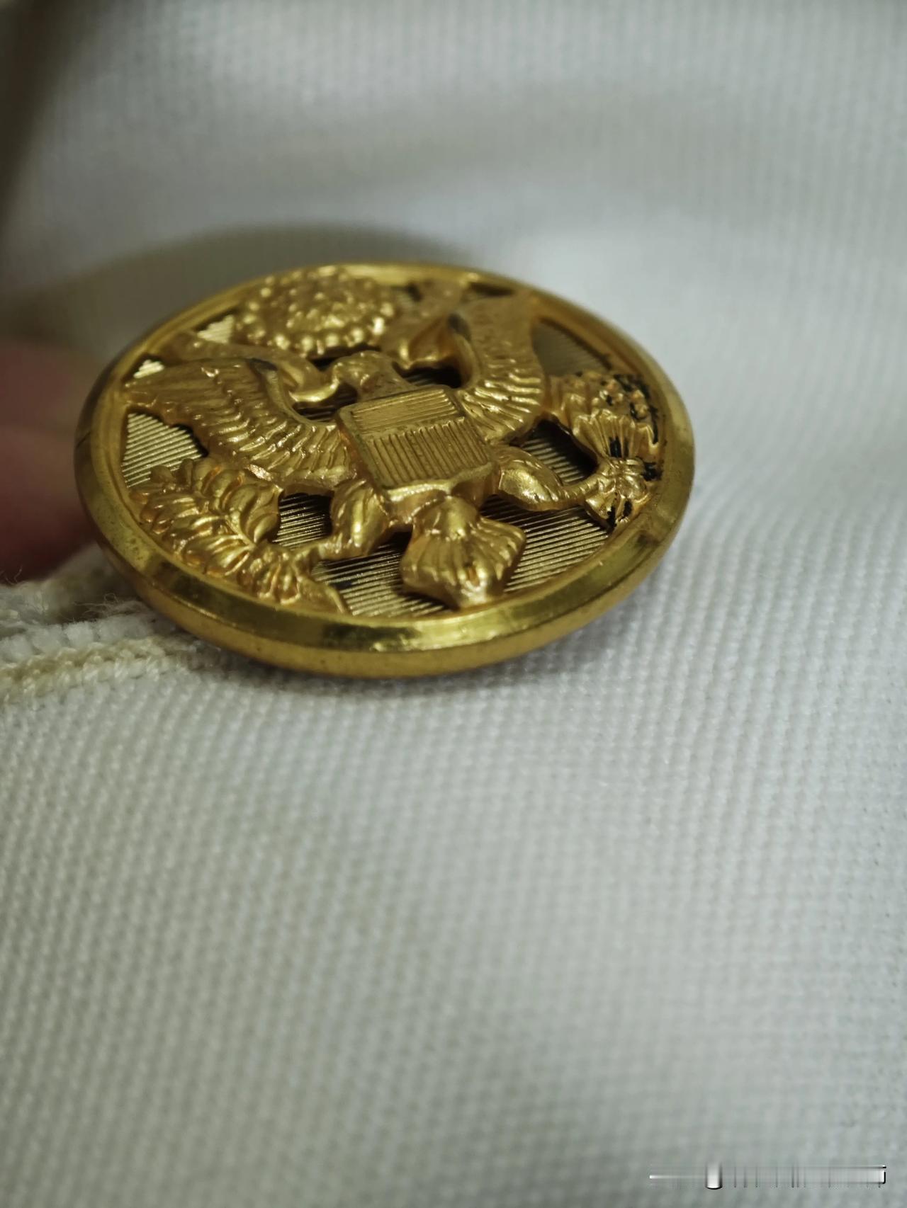 80年代美军校官的白礼服火了!袖口藏着咖啡印,背后故事太戳人 谁能想到,一件压箱底的白色旧军装,竟藏着冷战时期的“军人日常”?这可不是普通衣服,是80年代美国陆军校官的夏季白礼服,当年穿它的人,说不定在国际场合见过大世面! 先看细节有多讲究:纽扣是铜质镀金的,两层浮雕摸着手感超沉,阳光下亮得晃眼,一看就不是普通货色;面料更绝,“免烫”标签到现在还清晰,65%涤纶混35%人造丝,几十年过去照样挺括——要知道冷战时军官忙得脚不沾地,这种好打理的料子,简直是“体面救星”! 尺寸也透着当年军人的硬朗:胸围108cm、肩宽88cm,能撑起这衣服的,身材肯定很挺拔。但最有意思的是两处“小瑕疵”:衣襟上有明显的徽章印,到底曾别过什么荣誉勋章?右边袖口还有块浅咖色印子,老主人当年是赶时间喝咖啡洒的,还是和战友聊天时不小心弄上的? 现在冷战的故事早成了历史书里的字,可这件白礼服却像个“时光记录仪”。穿它的校官后来去哪了?那些没说出口的军旅故事,还藏在衣服的针脚里吗?你觉得这衣服背后,还藏着哪些没被发现的秘密?