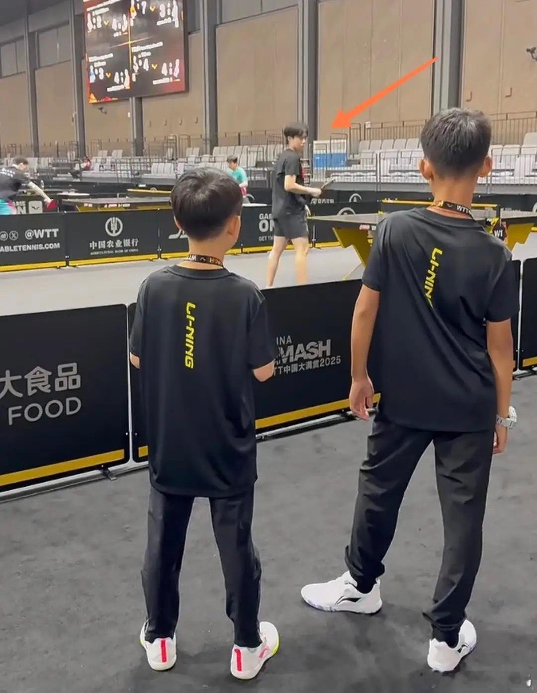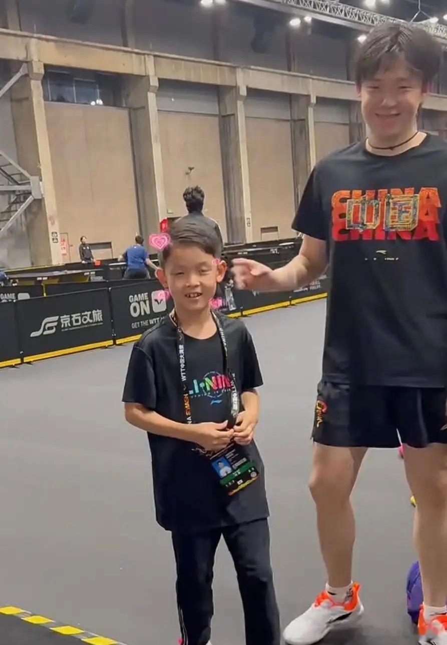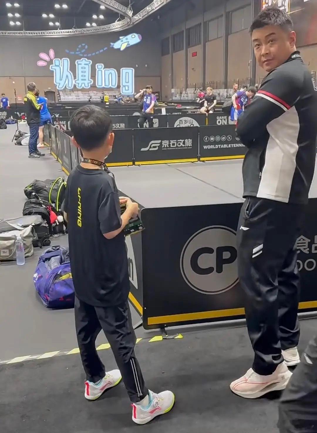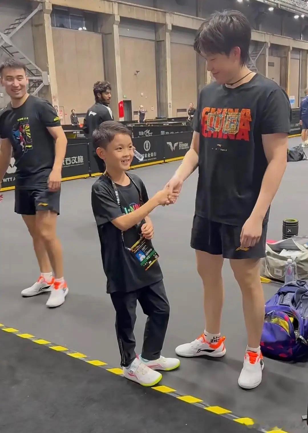 王皓带8岁小儿子进国乒训练场,海螺弟弟观看训练赛,和“偶像”王楚钦握手,现场追星